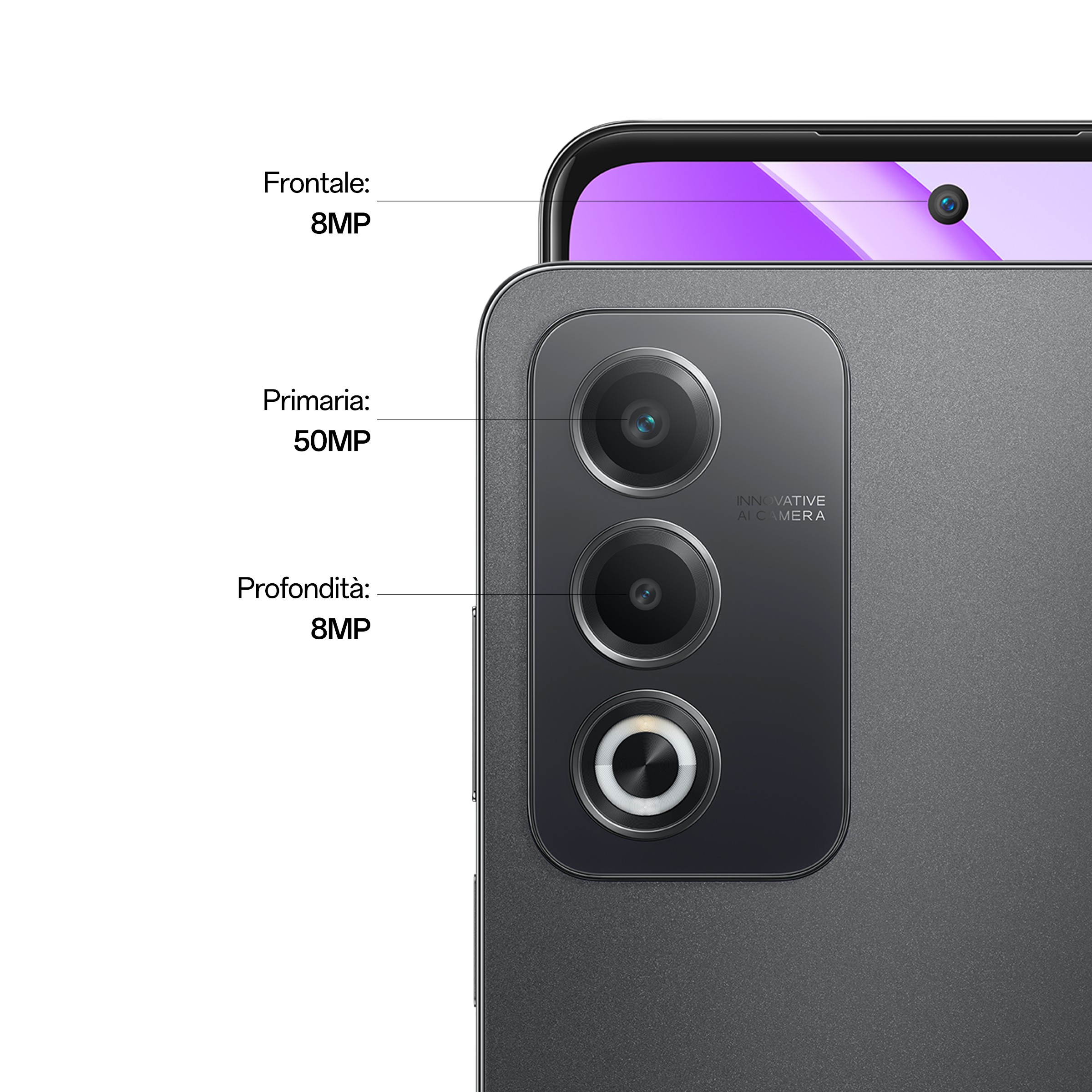 OPPO A80 5G è dotato di una doppia fotocamera in alta risoluzione (Primaria 50MP, Profondità 2MP). Grazie alla presenza dell’ IA, è possibile cancellare dalle foto oggetti o soggetti indesiderati, così gli scatti saranno sempre ottimizzati, anche nelle condizioni più complesse. Inoltre, la presenza della fotocamera bokeh da 2MP, garantisce scatti in modalità Ritratto nitidi, precisi e dettagliati.