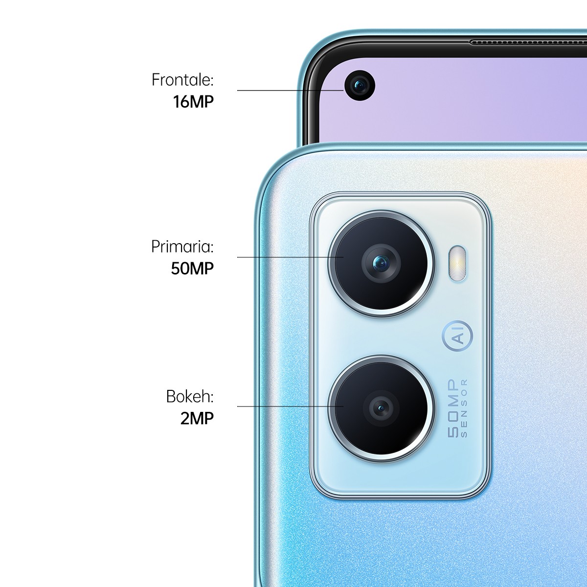 OPPO A96 è dotato di una doppia fotocamera con design verticale, come nei modelli di fascia più alta. Le fotocamere (Primaria 50MP, Profondità 2MP) grazie alla presenza dell’I.A. integrano tecnologie quali Natural Retouching e Ultra Night Mode per foto e video sempre perfetti. La batteria da 5000mAh di OPPO A96 garantisce una grande autonomia di utilizzo, più di qualsiasi altro smartphone nella stessa fascia prezzo. Grazie alla tecnologia superVOOC 33W infine ci consente di ricaricare in modo rapido e sicuro il nostro dispositivo. Il design posteriore 3D garantisce una presa sicura e confortevole. Lo sblocco con impronta digitale laterale, combinato al pulsante di accensione, fornisce un’esperienza di utilizzo comoda e immediata. L’esclusiva lavorazione OPPO GLOW della scocca posteriore dona al dispositivo un aspetto brillante ed elegante in entrambe le colorazioni rendendolo resistente a graffi e alle impronte.