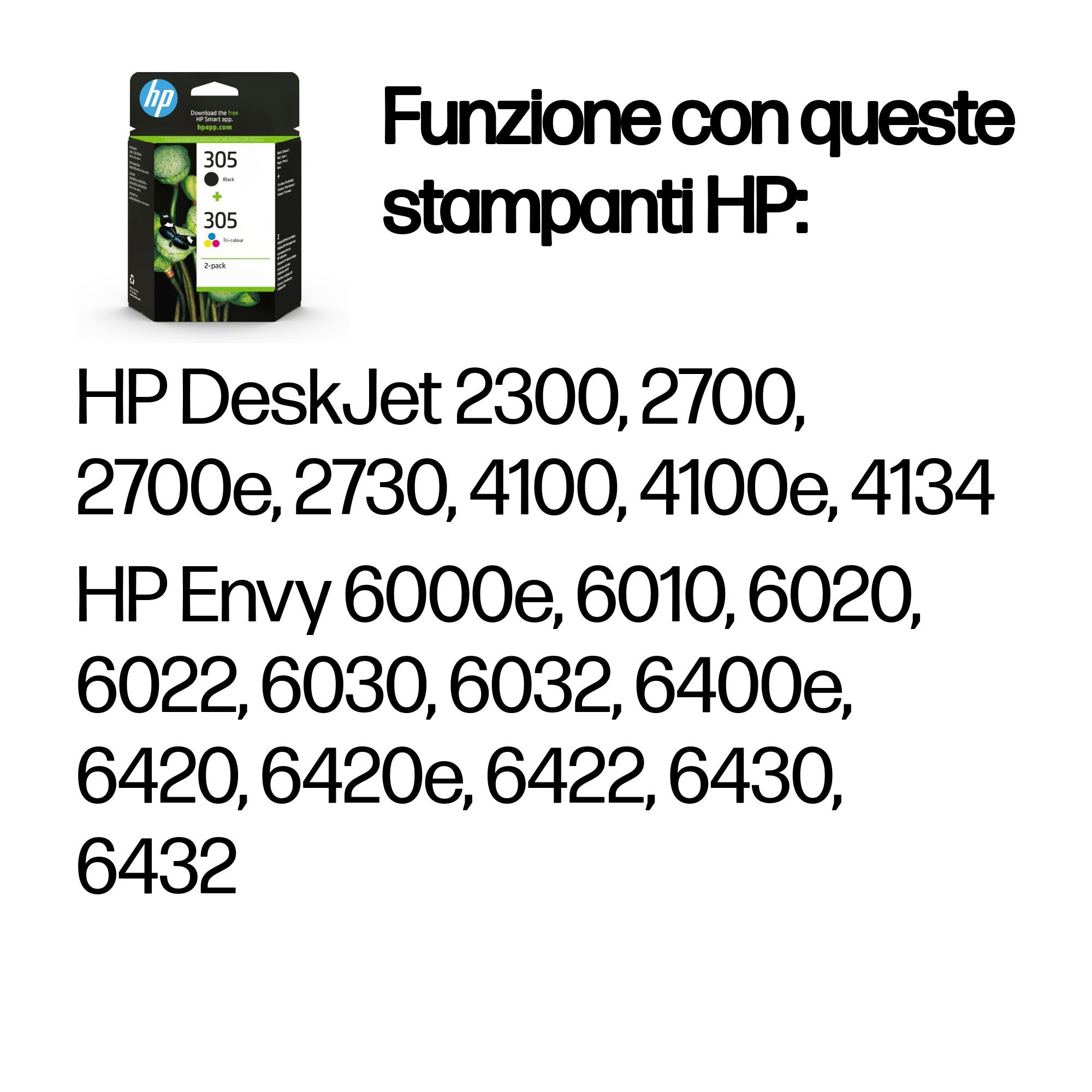 | Compatibilità | Le cartucce di inchiostro originali HP 305 funzionano con i seguenti dispositivi: HP DeskJet 2300, 2700, 2700e, 2730, 4100, 4100e, 4134 HP ENVY 6000e, 6010, 6020, 6022, 6030, 6032, 6420, 6422, 6430, 6432 HP Envy 6000e, 6400e, 6420e |
