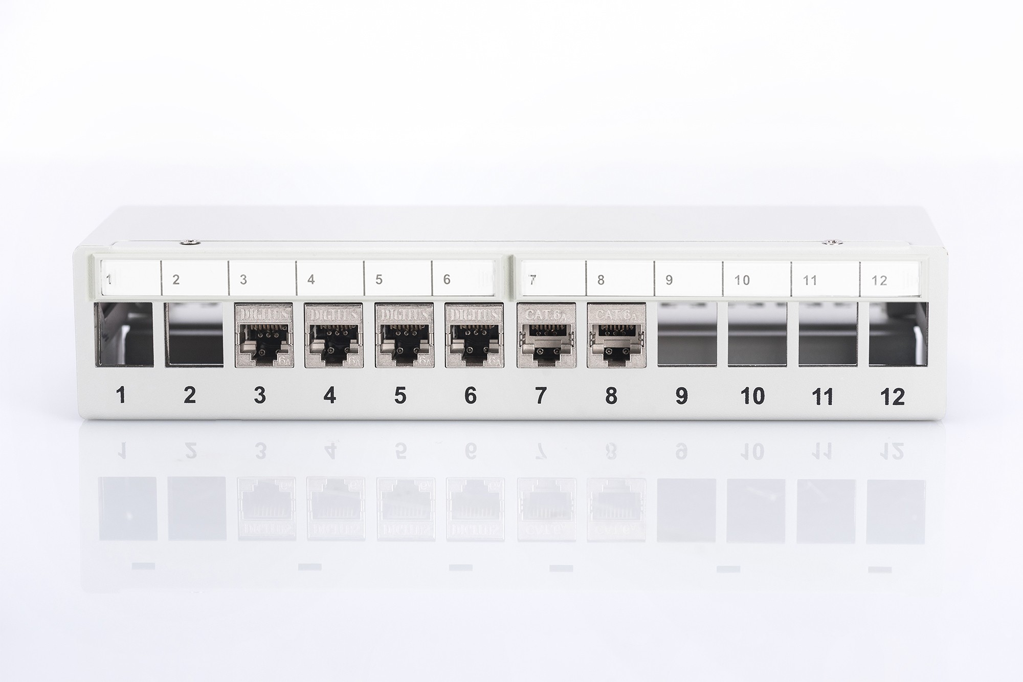 Digitus Desktop Modular Patch Panel, shielded, 12-port, RJ-45, Grigio, Montaggio a rack, 1U, 125 mm, 265 mm