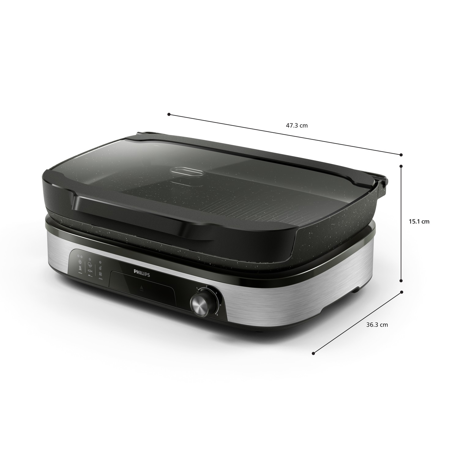 Philips Grill da tavolo, Nero, Acciaio inox, Alluminio, Policarbonato (PC), Polipropilene (PP), Silicone, Vetro temperato, Rettangolare, Manopola, 210±20 °C, Griglia + piastra