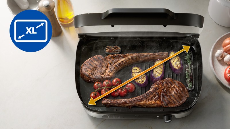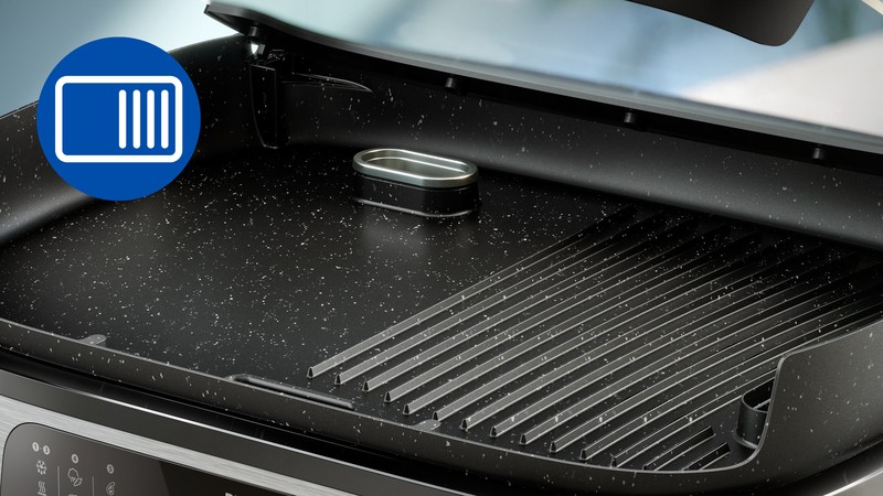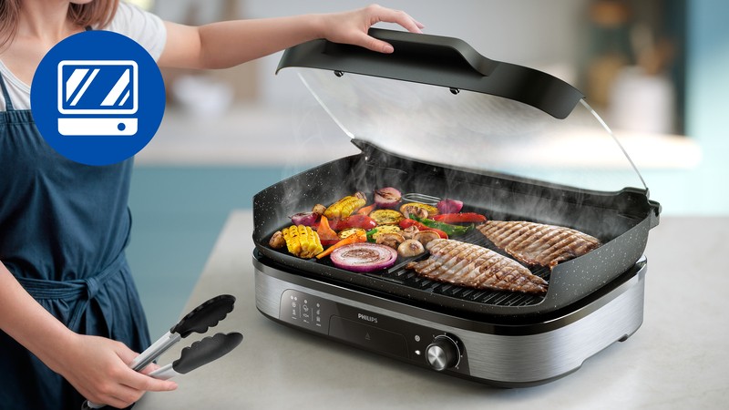 Ottieni il massimo da una grigliata fatta in casa con il grill da tavolo Philips. Dall'aroma affumicato alle bistecche più tenere, il coperchio in vetro sigilla i sapori dei deliziosi piatti preparati alla griglia.