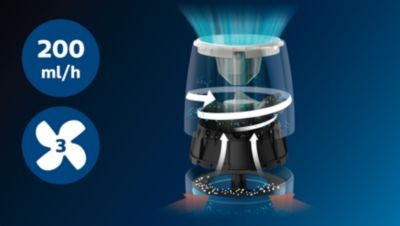 Le 3 velocità della ventola e le impostazioni automatiche garantiscono le prestazioni e il comfort che si desidera. Con un'emissione fino a 200 ml/h, umidifica efficacemente qualsiasi stanza fino a 32 m2. (2,3)