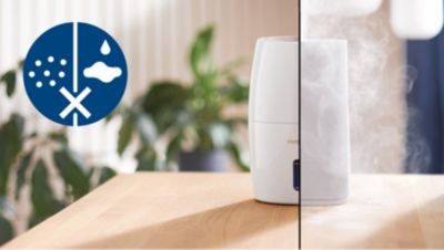 Le particelle invisibili di NanoCloud non rilasciano polvere bianca né lasciano superfici umide nella stanza (4). Le goccioline più grandi emesse dagli umidificatori ultrasonici possono rendere umido l'ambiente circostante e trasportare minerali che lasciano residui bianchi sulle superfici vicine. Le particelle della tecnologia NanoCloud sono troppo piccole per trasportare i minerali, prevenendo in modo efficace residui e macchie.