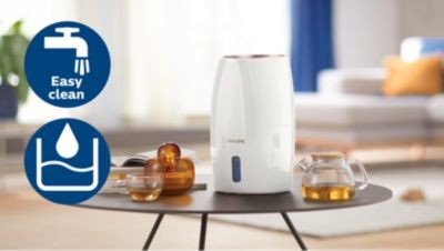 Un ampio serbatoio dell'acqua assicura ore di umidificazione ininterrotta. Il rifornimento è semplice, basta sollevare il coperchio. Il design facile da pulire consente di mantenere l'umidificatore e l'aria di casa puliti e igienizzati.