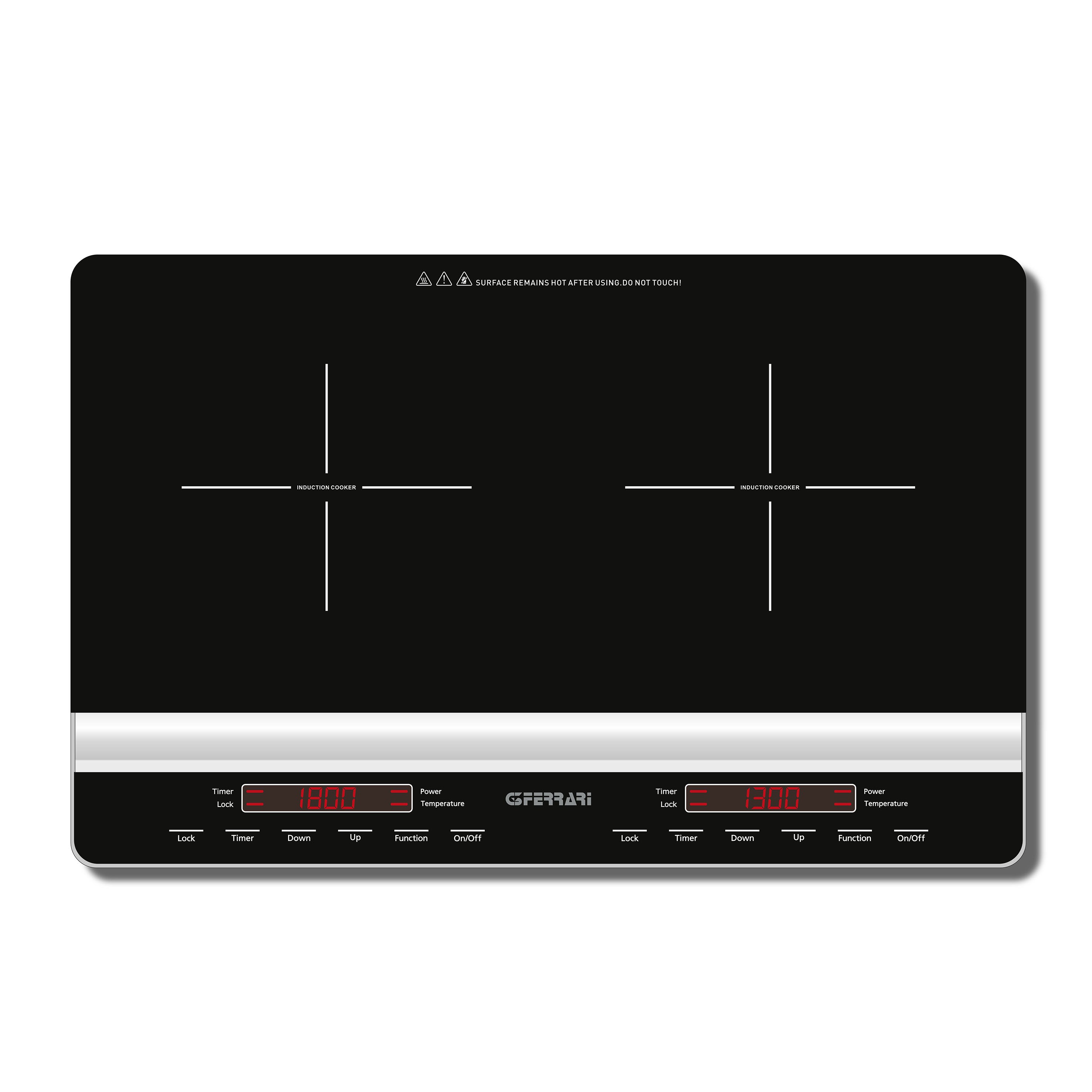 G3 Ferrari Dinamiko Duo. Colore del prodotto: Nero, Posizionamento dell'apparecchio: Superficie piana, Dimensione della larghezza del piano cottura: 56 cm. Bruciatore piccolo: 1300 W, Bruciatore medio: 1800 W, Range di temperatura (T-T): 60 - 240 °C. Tipo di controllo: Touch, Posizione di controllo: Frontale superiore, Timer da 30 minuti: 180 min. Potenza aggregata (elettrica): 3100 W, Tensione di ingresso AC: 230 V, Frequenza di ingresso AC: 50/60 Hz. Larghezza: 560 mm, Profondità: 360 mm, Altezza: 50 mm