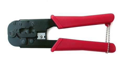 Pinze universali con le quali si possono crimpare i connettori da 6 e da 8 poli, sia schermati che non schermati. sul cavo piatto o rotondo, ad esempio il cavo di rete o il cavo telefonico. La pinza serve anche per spelare il cavo piatto o per tagliarlo. Attrezzo in metallo.
