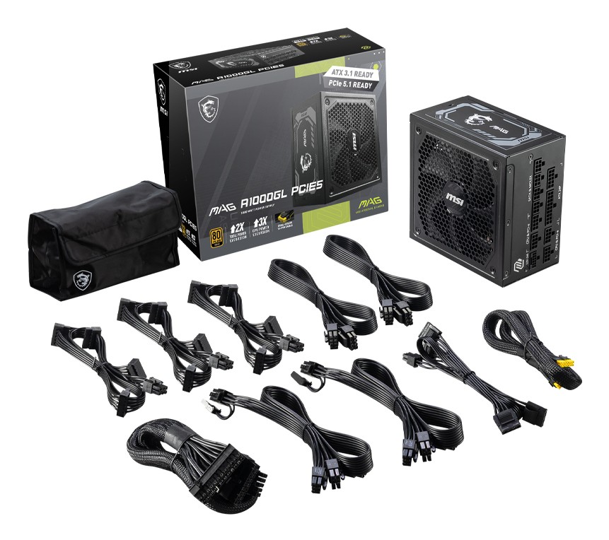 MSI MAG A1000GL PCIE5. Potenza totale: 1000 W, Tensione di ingresso AC: 100 - 240 V, Frequenza di ingresso AC: 50/60 Hz. Connettore scheda madre: 24-pin ATX, Lunghezza del cavo di alimentazione della scheda madre: 60 cm, Lunghezza del cavo di alimentazione SATA: 150,500 mm. Utilizzo: PC, Fattore di forma dell'unità di alimentazione (PSU): ATX, Certificazione 80 PLUS: 80 PLUS Gold. Colore del prodotto: Nero, Tipo di raffreddamento: Attivo, Diametro del ventilatore: 13,5 cm. Larghezza: 150 mm, Profondità: 150 mm, Altezza: 86 mm