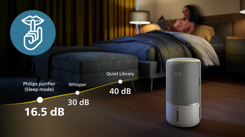 Dormi sonni tranquilli con il nostro innovativo purificatore. In modalità silenziosa, funziona ad appena 16,5 dB (9), più impercettibile di un sussurro. Inoltre, la luce del display digitale si attenua, riducendo al minimo eventuali disturbi.