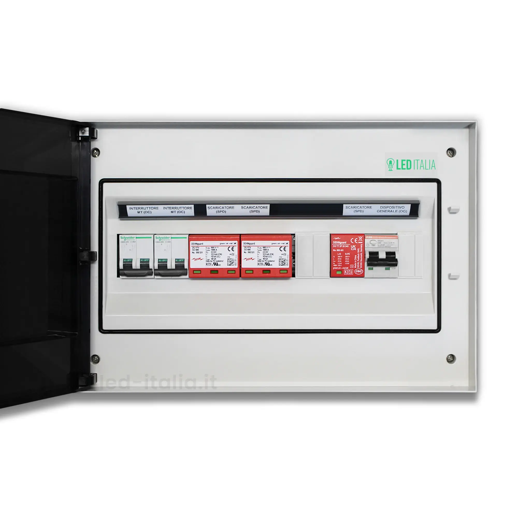 Quadro combinato AC/DC monofase 8kW con 2/2 MPPT, magnetotermico differenziale ABB 40A lato AC e magnetotermici Schneider 25A lato DC. Dotato di SPD AC/DC DEHNguard 600V e centralino Siemens IP65 a 18 moduli.