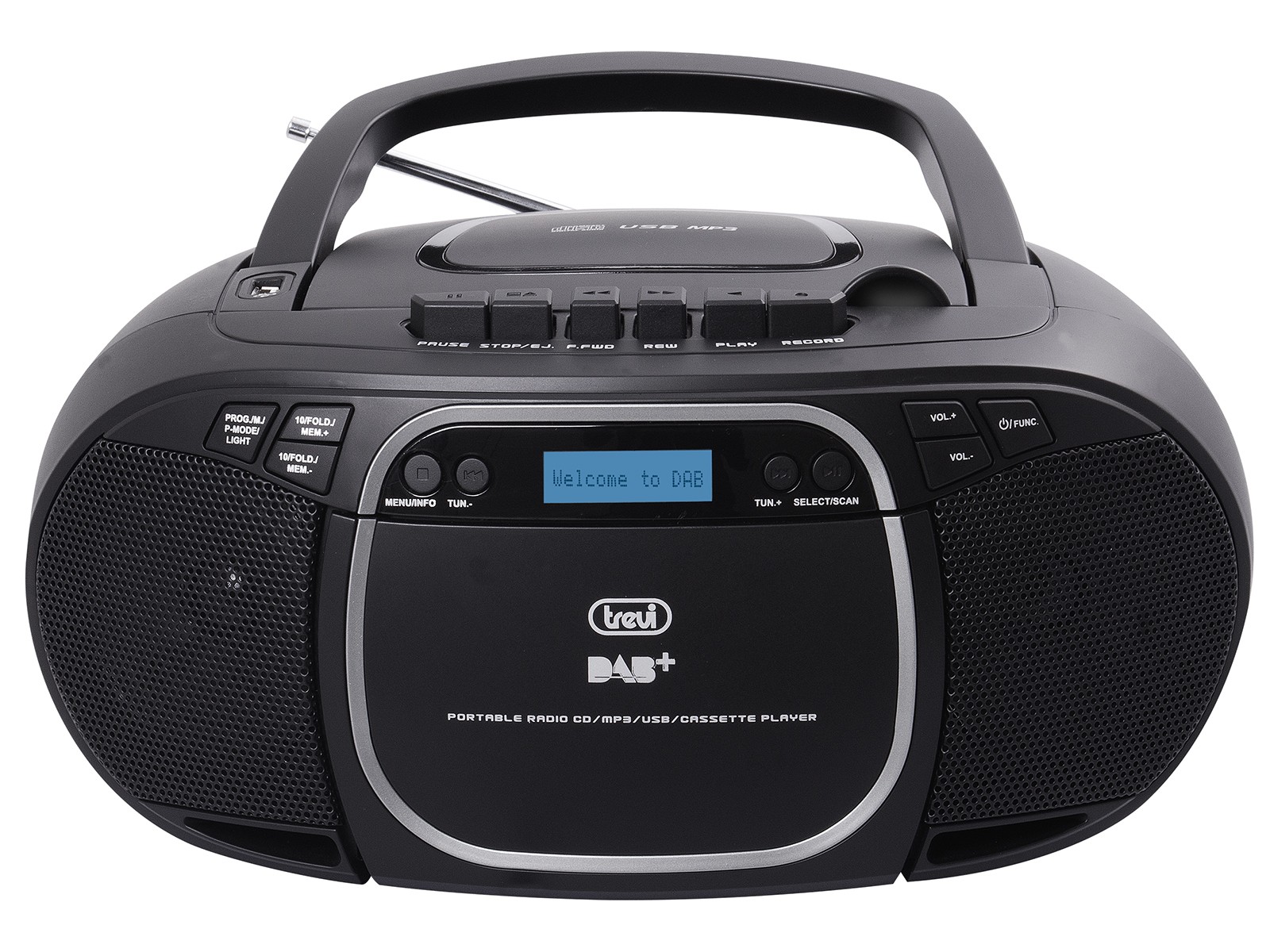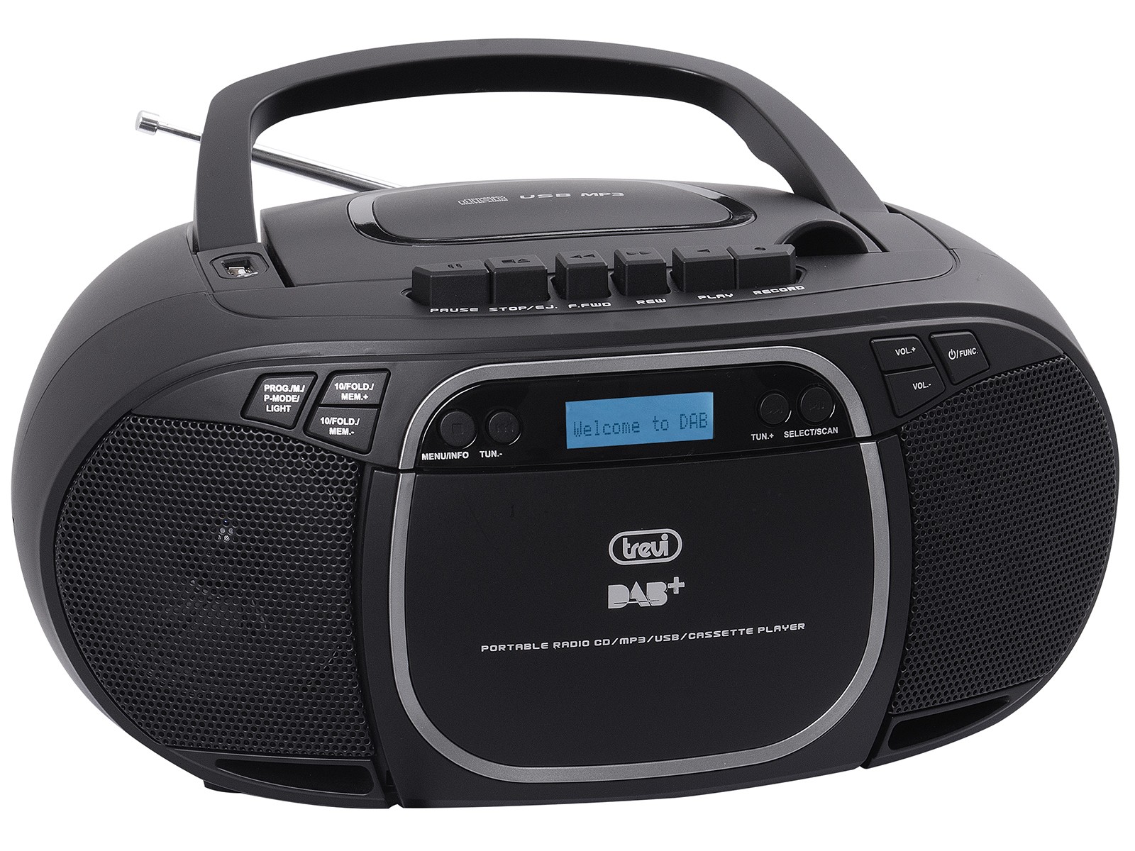Lo Stereo Portatile DAB Trevi CMP 576 DAB con Radio DAB è l’ideale per ascoltare tutta la tua musica preferita ovunque vorrai. Grazie alla radio DAB, oltre alle classiche frequenze radio analogiche, con lo stereo portatile di Trevi potrai ascoltare anche tutte le stazioni che trasmettono con segnale digitale con massima sensibilità di precisione e sintonia, memorizzando fino ad un massimo di 30 stazioni in DAB e 30 in FM per un accesso facile e rapido alle tue preferite. Leggero e facile da trasportare, CMP 576 DAB possiede un comodo display “Dot Matrix” per una visione ottimale ed alta leggibilità. È dotato di lettore CD, ingressi USB e AUX-IN per il collegamento di dispositivi compatibili e memorie flash e di vano cassetta, grazie al quale potrai rispolverare e riascoltare le tue vecchie musicassette.