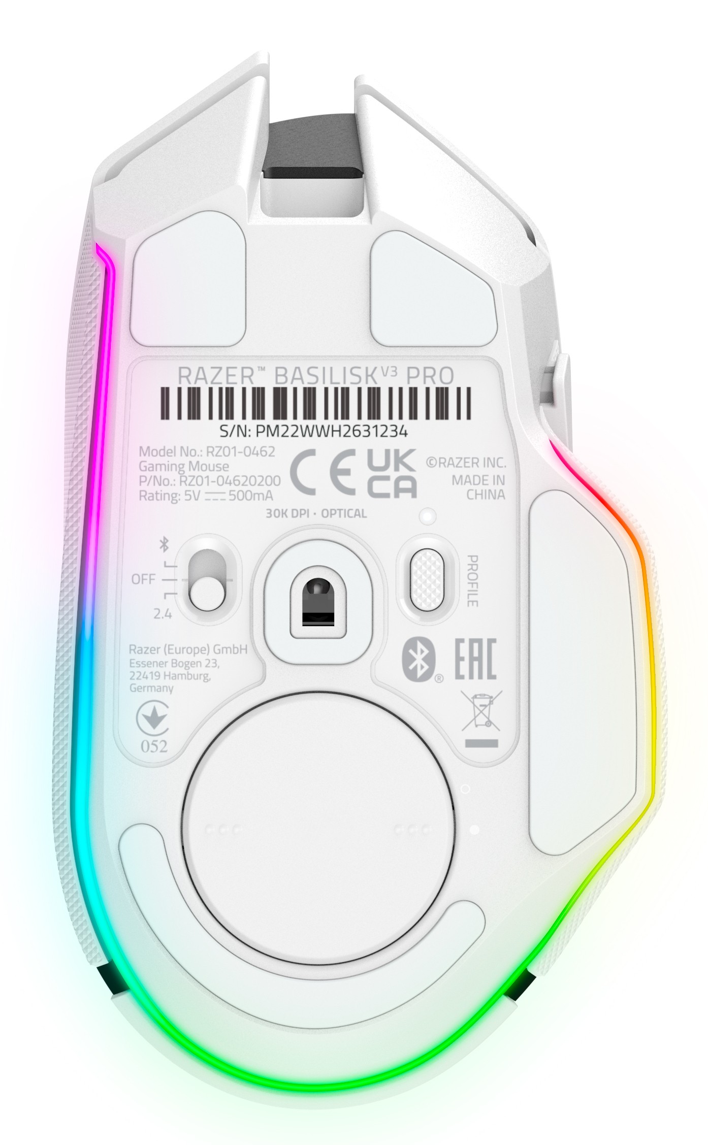 Razer Basilisk V3 Pro, Mano destra, Ottico, RF Wireless + Bluetooth + USB Type-C, 30000 DPI, Bianco