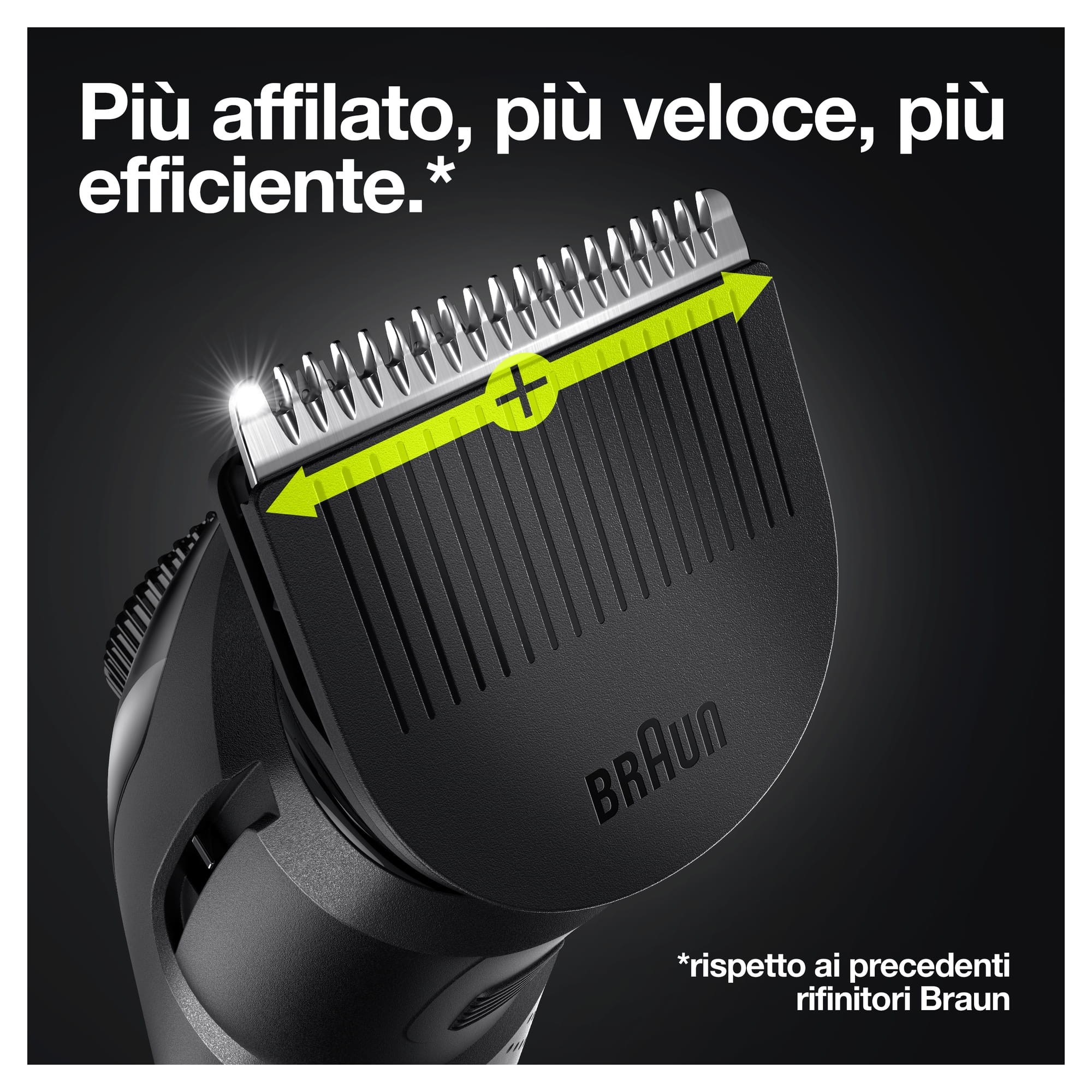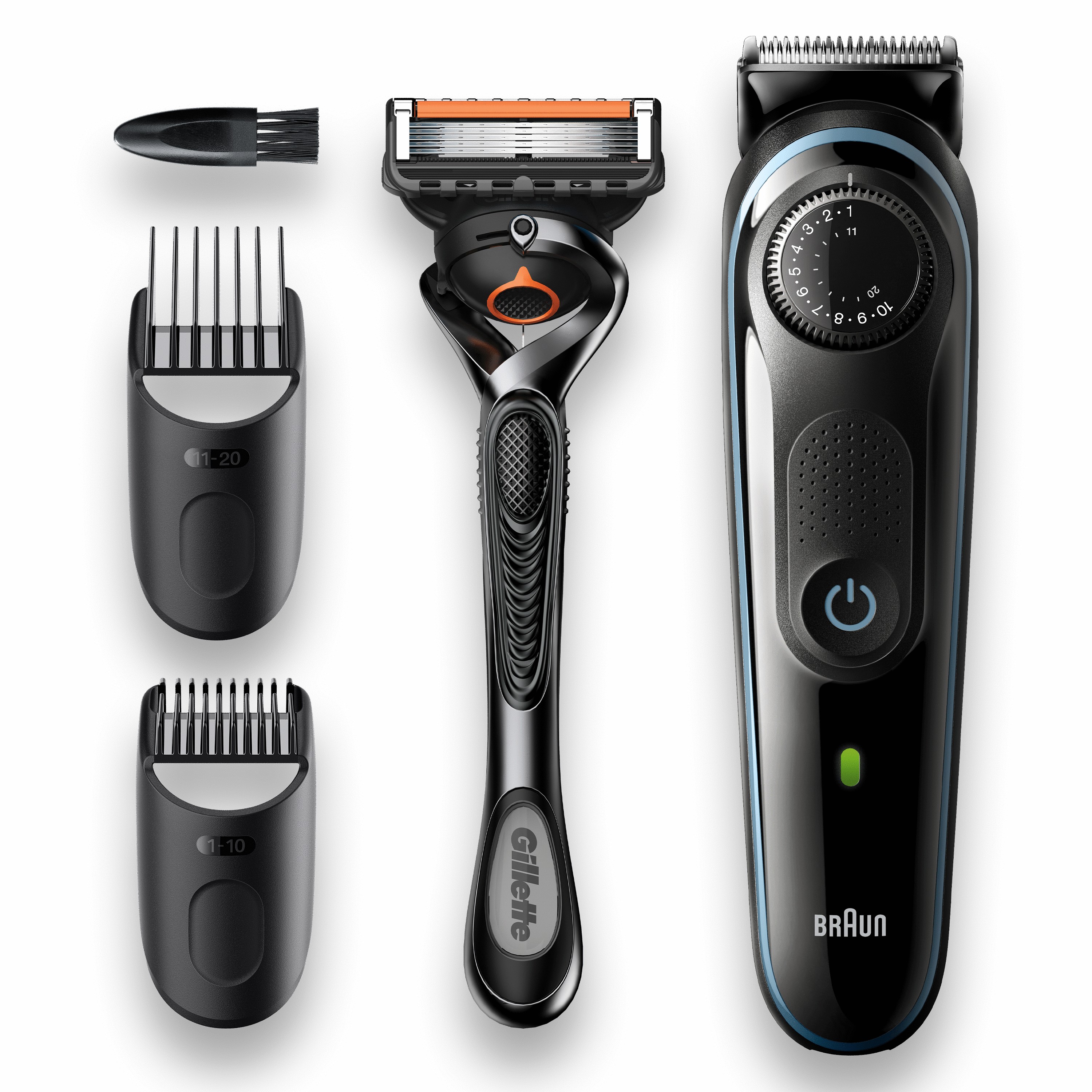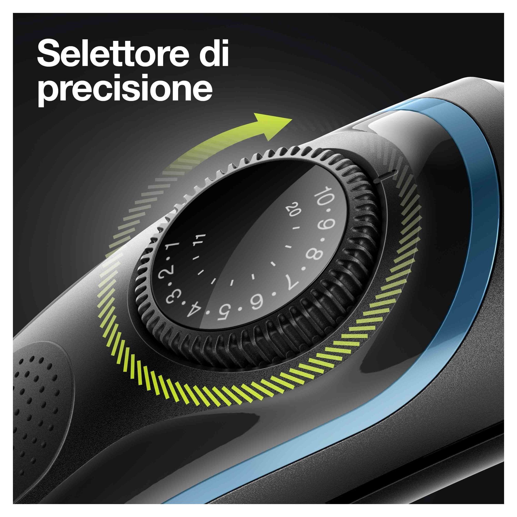 Crea il tuo stile in tutta semplicità con il regolabarba uomo e tagliacapelli Braun BT5. Questo regolabarba è più affilato, veloce ed efficiente, con un’area di taglio più ampia per catturare e tagliare più peli a ogni passata*. Il regolabarba 5 è dotato di un selettore di precisione con 39 impostazioni di lunghezza, lame affilate di lunga durata e batteria Li-Ion. I pettini e la testina del rifinitore sono lavabili. *rispetto ai precedenti rifinitori Braun La confezione comprende: 1 regolabarba e tagliacapelli uomo 2 pettini di precisione per barba e capelli 1 Fusion Proglide 1 spazzolina di pulizia 1 alimentatore intelligente 1 manuale di Istruzioni