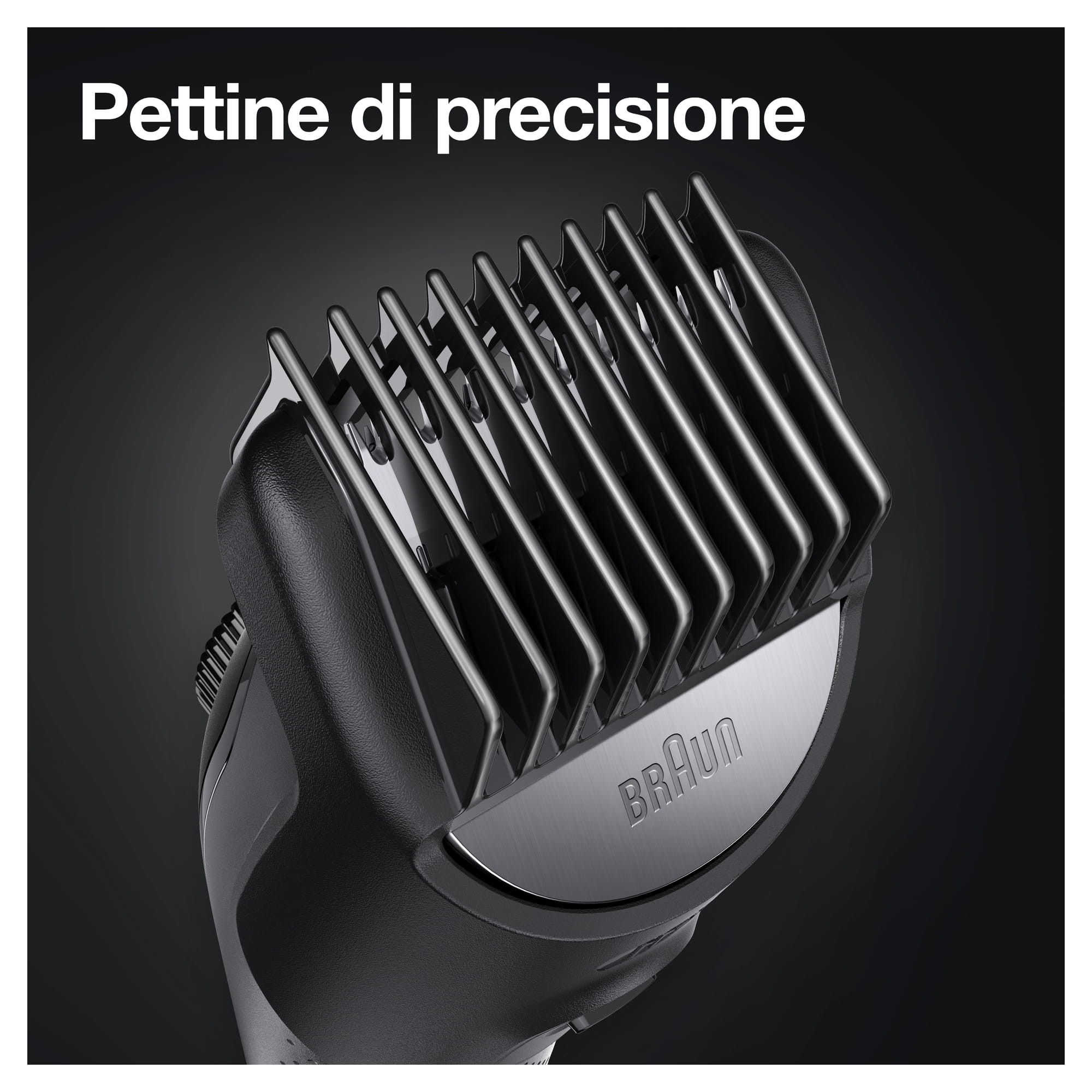 Crea il tuo stile in tutta semplicità con il regolabarba uomo e tagliacapelli Braun BT7. Questo regolabarba è più affilato, veloce ed efficiente, con un’area di taglio più ampia per catturare e tagliare più peli a ogni passata*. Il regolabarba 7 è dotato di un selettore di precisione con 39 impostazioni di lunghezza, lame affilate di lunga durata e batteria Li-Ion. I pettini e la testina del rifinitore sono lavabili. *rispetto ai precedenti rifinitori Braun La confezione comprende: 1 regolabarba e tagliacapelli uomo 2 pettini di precisione per barba e capelli 1 mini testina radente a lamina 1 testina del rifinitore di precisione 1 Fusion Proglide 1 custodia 1 spazzolina di pulizia 1 alimentatore intelligente 1 manuale di Istruzioni