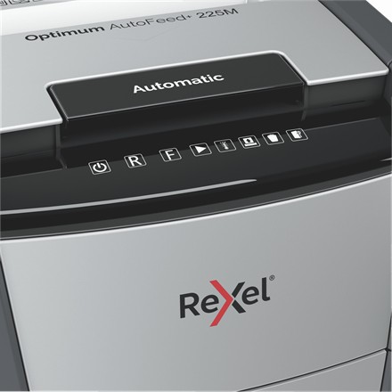 Rexel AutoFeed+ 225M. Tipo di sminuzzamento: Taglio a frammenti, Ampiezza di funzionamento: 23 cm, Dimensione di sminuzzamento: 2x15 mm. Larghezza: 415 mm, Profondità: 465 mm, Altezza: 735 mm