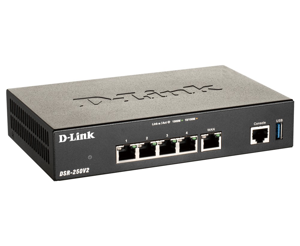 D-Link DSR-250V2. Wi-Fi standard: 802.11g, Standard Wi-Fi: 802.11g. Tipo di interfaccia LAN Ethernet: Gigabit Ethernet, Velocità trasferimento Ethernet LAN: 10,100,1000 Mbit/s. Algoritmi di sicurezza supportati: 3DES, 128-bit RC4, AES, SNMP, SNMPv2, SNMPv3. Protocollo di routing: OSPF, OSPFv3, RIP-1, RIP-2. Tipo di prodotto: Router da tavolo/palo, Colore del prodotto: Nero