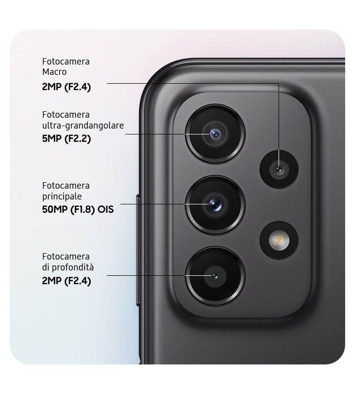 Scatta foto di livello superiore con la fotocamera multi-obiettivo di Galaxy A23 5G: scatti più nitidi con la fotocamera OIS da 50MP, angolo di visione più ampio con l’ultra-grandangolare, messa a fuoco personalizzata con la fotocamera di profondità e primi piani dettagliati con la fotocamera macro.