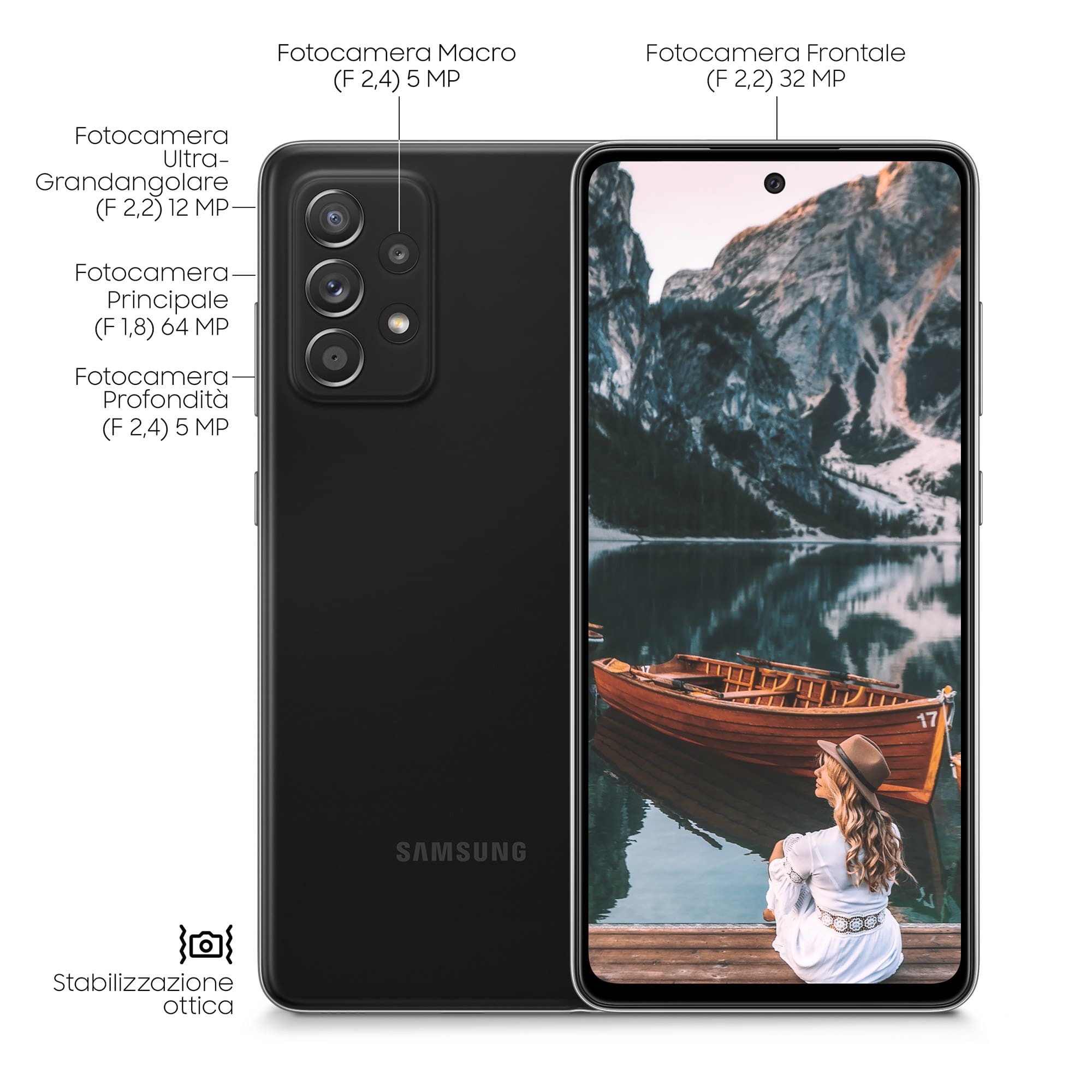 Samsung Galaxy A52 128 GB Display 6.5” FHD+ Super AMOLED Awesome Black. Dimensioni schermo: 16,5 cm (6.5"), Risoluzione del display: 2400 x 1080 Pixel, Tipo di display: SAMOLED. Famiglia processore: Qualcomm Snapdragon, Modello del processore: 720G. Capacità della RAM: 6 GB, Capacità memoria interna: 128 GB. Risoluzione fotocamera posteriore (numerico): 64 MP, Tipo di fotocamera posteriore: Telecamera per quad. Capacità della scheda SIM: Doppia SIM. Sistema operativo incluso: Android 11. Capacità della batteria: 4500 mAh. Colore del prodotto: Nero. Peso: 189 g