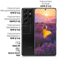 Samsung Galaxy S21 Ultra 5G 128GB Display 6.8" Dynamic AMOLED 2X Phantom Black. Dimensioni schermo: 17,3 cm (6.8"), Risoluzione del display: 3200 x 1440 Pixel, Tipo di display: Dynamic AMOLED 2X. Frequenza del processore: 2,9 GHz, Famiglia processore: Samsung Exynos, Modello del processore: 2100. Capacità della RAM: 12 GB, Capacità memoria interna: 128 GB. Risoluzione fotocamera posteriore (numerico): 108 MP, Tipo di fotocamera posteriore: Telecamera per quad. Capacità della scheda SIM: Doppia SIM. Sistema operativo incluso: Android 11. Capacità della batteria: 5000 mAh. Colore del prodotto: Nero. Peso: 228 g