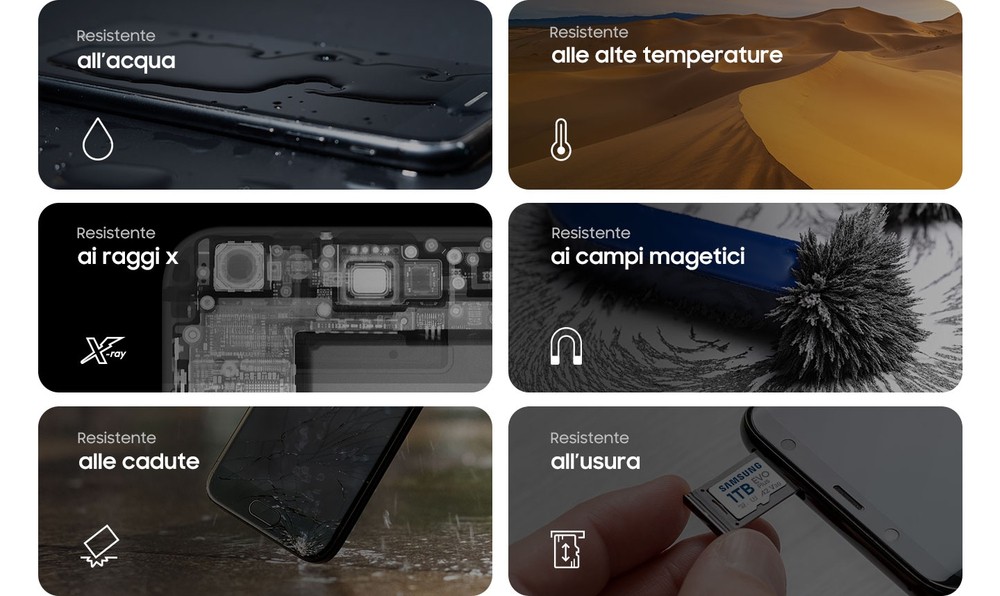 6 livelli di protezione. EVO Plus è attrezzata per vivere ogni avventura, grazie a unelevata resistenza ad acqua[5] , temperature estreme[6] , raggi X[7] , campi magnetici[8] , cadute[9] e usura[10]. La massima affidabilità per proteggere esperienze uniche e preziose. Tutto questo con una garanzia limitata di 10 anni.