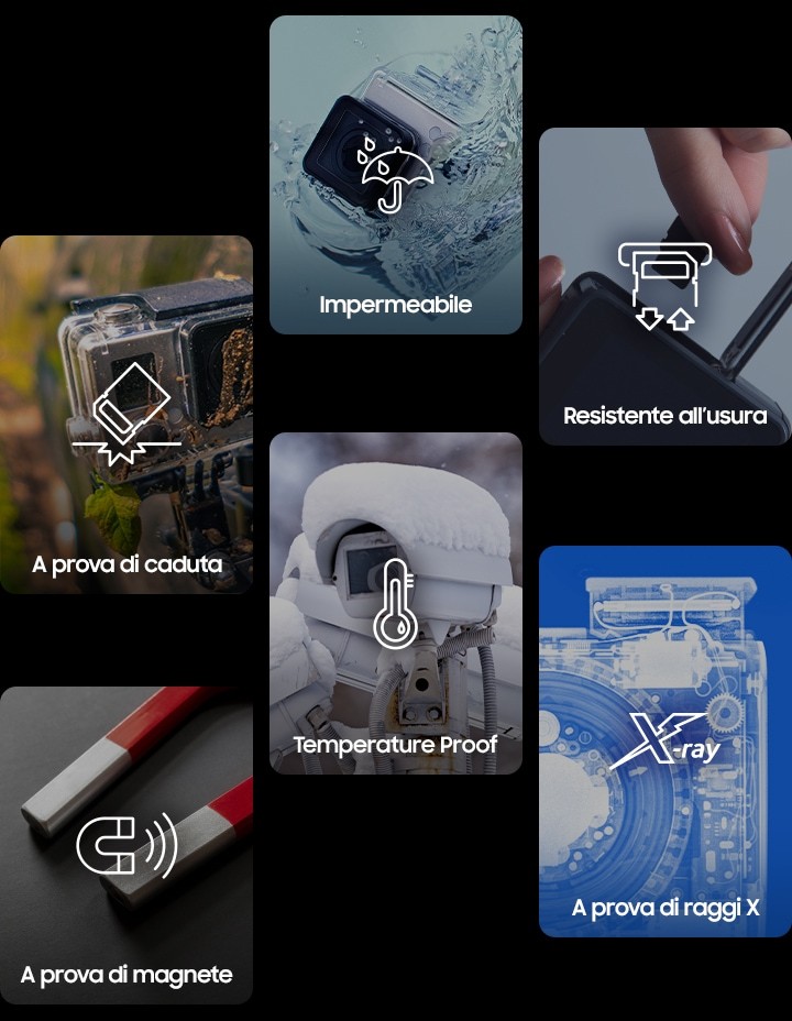 Da condizioni atmosferiche proibitive a un utilizzo intenso, la PRO Endurance si dimostra all’altezza di ogni situazione. Test rigorosi hanno dimostrato la sua resistenza ai magneti¹, ai raggi X², all’acqua³, alle cadute⁴ e all’usura⁵, con una temperatura di funzionamento che va da -25 °C a 85 °C⁶.
