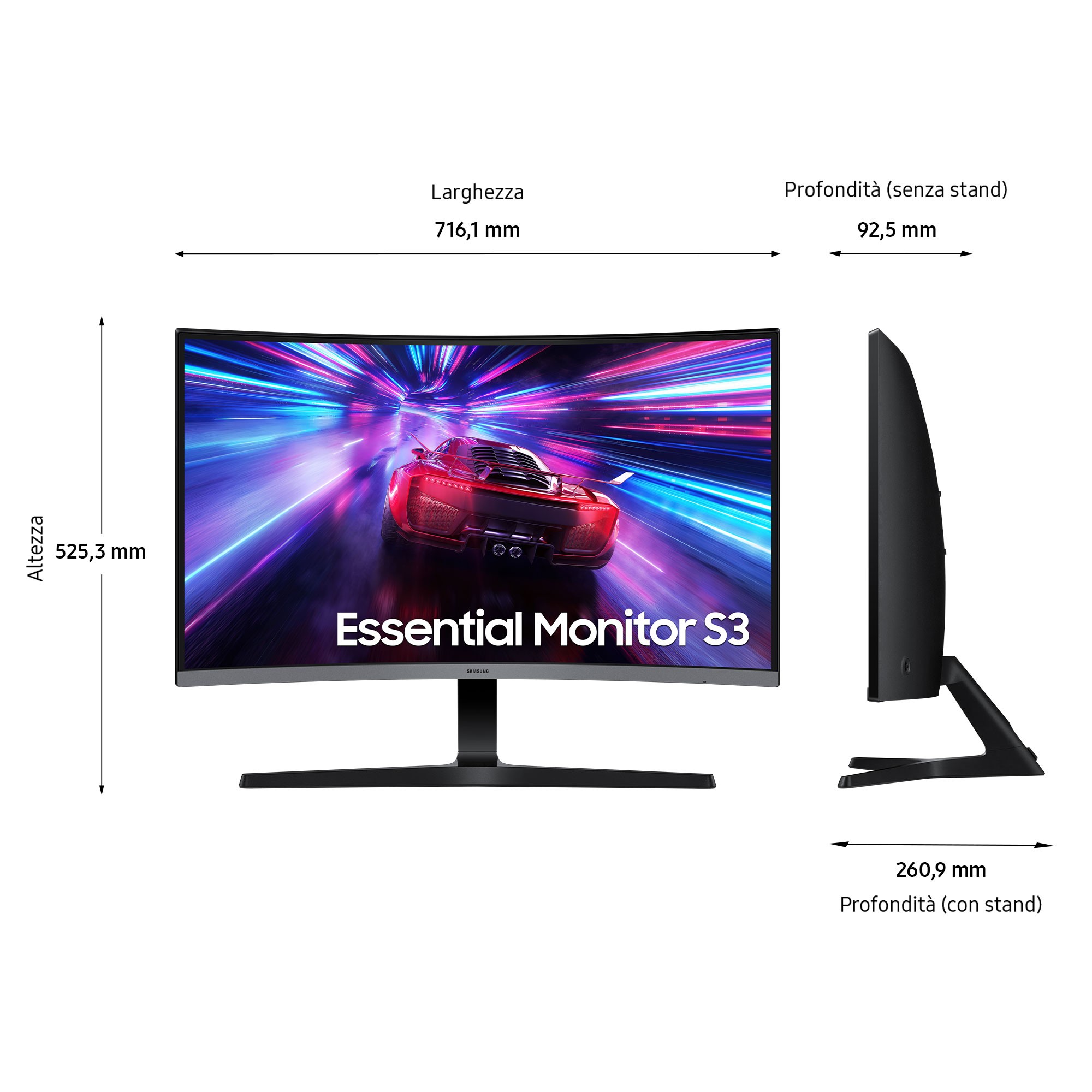 Samsung Monitor Curvo Serie S39GD da 32''. Dimensioni diagonale schermo: 81,3 cm (32"), Risoluzione del display: 1920 x 1080 Pixel, Tipologia HD: Full HD, Tecnologia display: LCD, Tempo di risposta: 4 ms, Rapporto d'aspetto nativo: 16:9, Angolo di visualizzazione (orizzontale): 178°, Angolo di visualizzazione (verticale): 178°. Montaggio standard VESA. Colore del prodotto: Nero