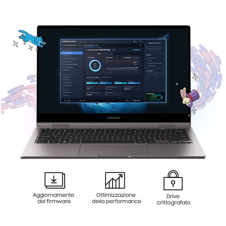 Lascia che il tuo SSD funzioni come per magia. Gli strumenti di ottimizzazione del software Samsung Magician assicurano la massima efficienza dellunità SSD. È un modo sicuro e semplice per migrare tutti i dati per un aggiornamento dell'unità SSD Samsung. Proteggi dati importanti, tieni monitorato lo stato del drive e ottieni gli ultimi aggiornamenti firmware.