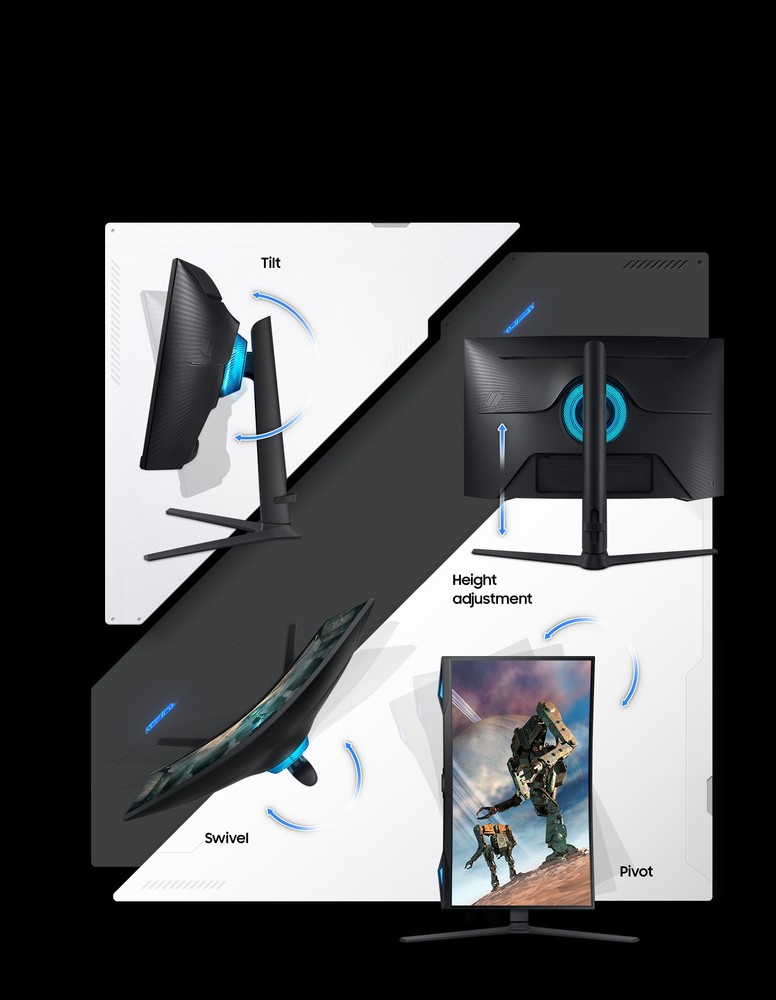 Trova la tua posizione vincente. Ruota, inclina e regola il monitor in altezza fino a trovare l’assetto ideale per la vittoria. Totalmente compatibile con le staffe VESA, lo schermo può essere facilmente collocato nella sua posizione ideale.
