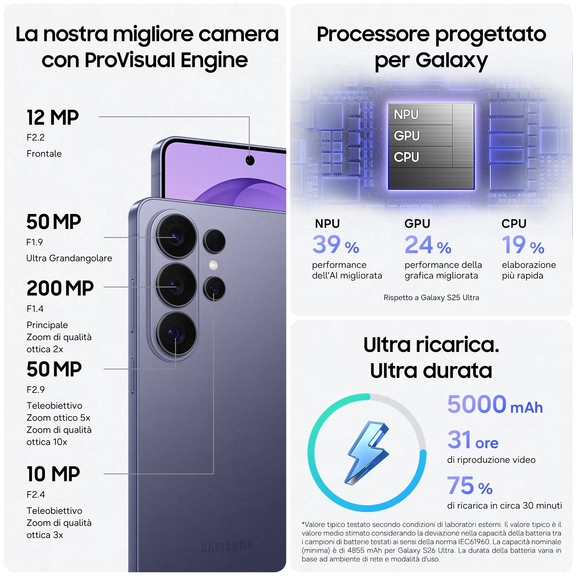 Scopri Samsung Galaxy S26 Ultra, lo smartphone AI per la prima volta con Privacy Display integrato, la nostra fotocamera più luminosa da 200MP e un processore potente che rende Galaxy AI ancora più intelligente. Tutto nel palmo della tua mano, per migliorare la tua quotidianità.