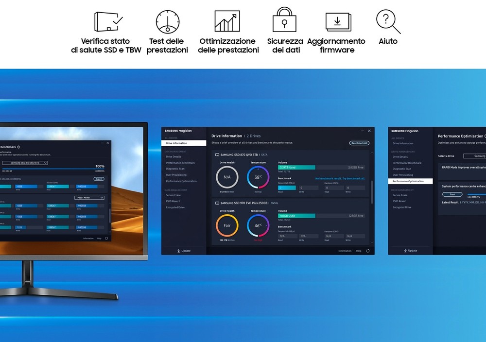 Lascia che il tuo drive funzioni come per magia. Il nuovo software Samsung Magician 6.1, ottimizzato, terrà il tuo SSD sotto controllo. Puoi facilmente gestire lunità grazie a unampia gamma di utili strumenti che ti consentono di stare al passo con gli ultimi aggiornamenti, monitorare la salute e lo stato del drive o persino incrementarne le prestazioni.