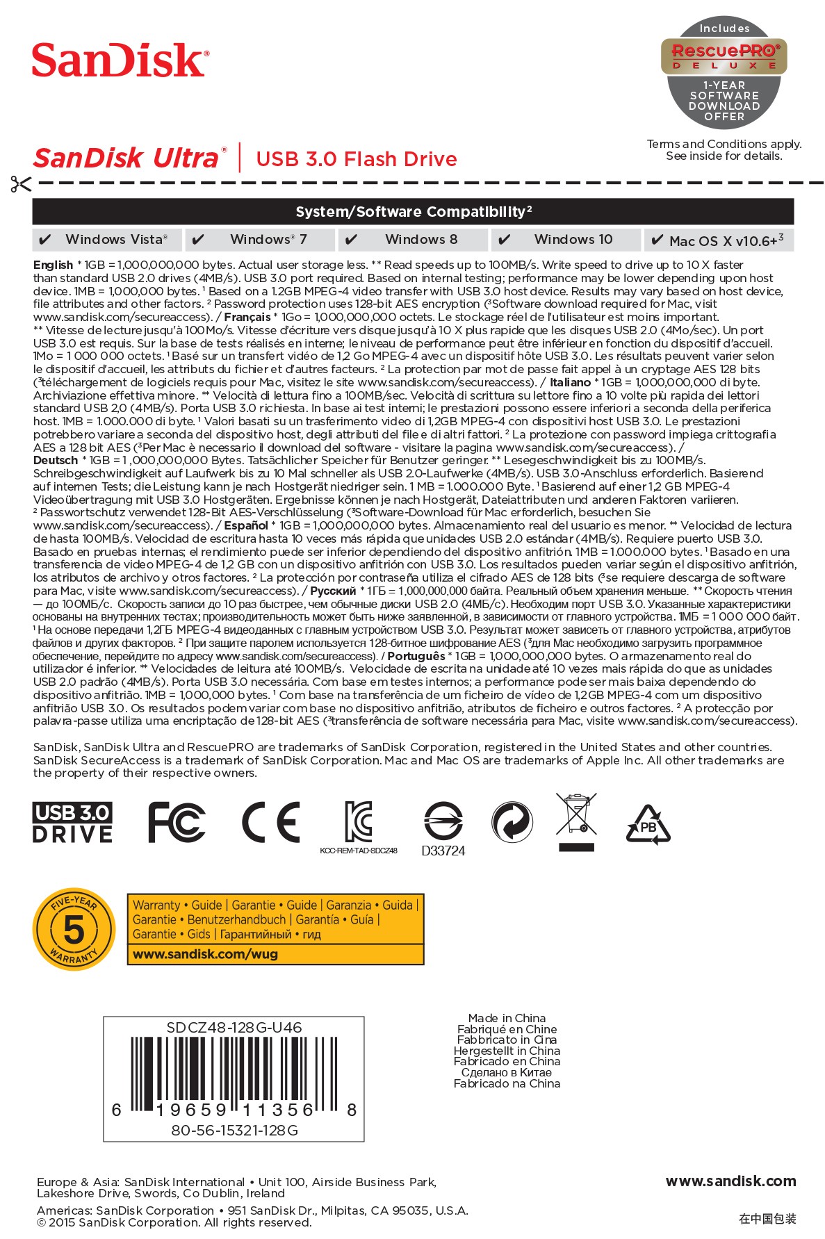 L’unità flash USB 3.0 SanDisk Ultra viene offerta con una garanzia limitata di cinque anni.