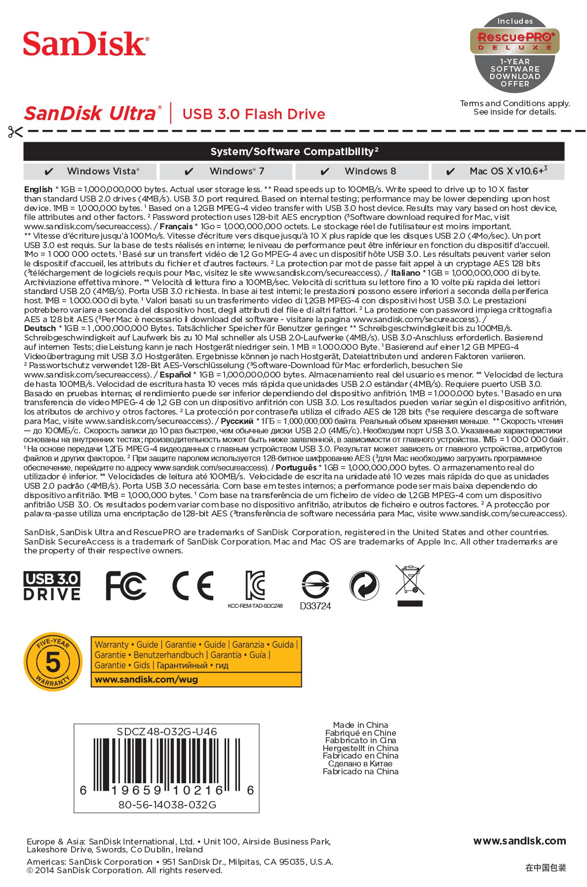 L’unità flash USB 3.0 SanDisk Ultra viene offerta con una garanzia limitata di cinque anni.