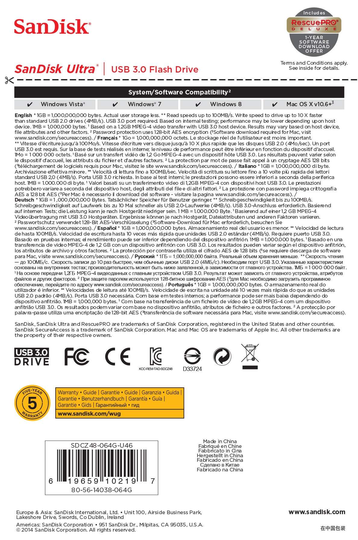 L’unità flash USB 3.0 SanDisk Ultra viene offerta con una garanzia limitata di cinque anni.