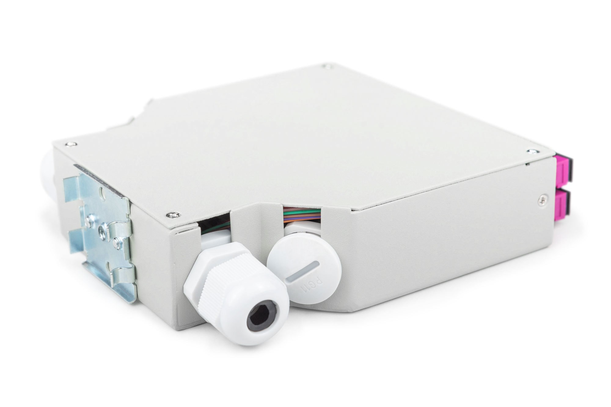 La scatola da guida top-hat per fibre ottiche è un alloggiamento speciale e compatto per la gestione, la distribuzione e la protezione efficiente dei cavi in fibra ottica in ambienti industriali e di telecomunicazione. È progettata per essere montata su una guida DIN ed è quindi ideale per l'installazione in armadi elettrici, pannelli di controllo e scatole di distribuzione. Il box viene fornito preconfigurato con i principali componenti in fibra ottica, tra cui adattatori, pigtail e vassoi di giunzione, fornendo una soluzione pronta all'uso che consente una rapida installazione e garantisce una connettività affidabile. Il design salvaspazio consente di montarlo in modo ordinato accanto ad altre apparecchiature senza ingombrare lo spazio di installazione. Le funzioni di gestione dei cavi contribuiscono a mantenere l'integrità delle connessioni in fibra ottica e a prevenire la degradazione del segnale.