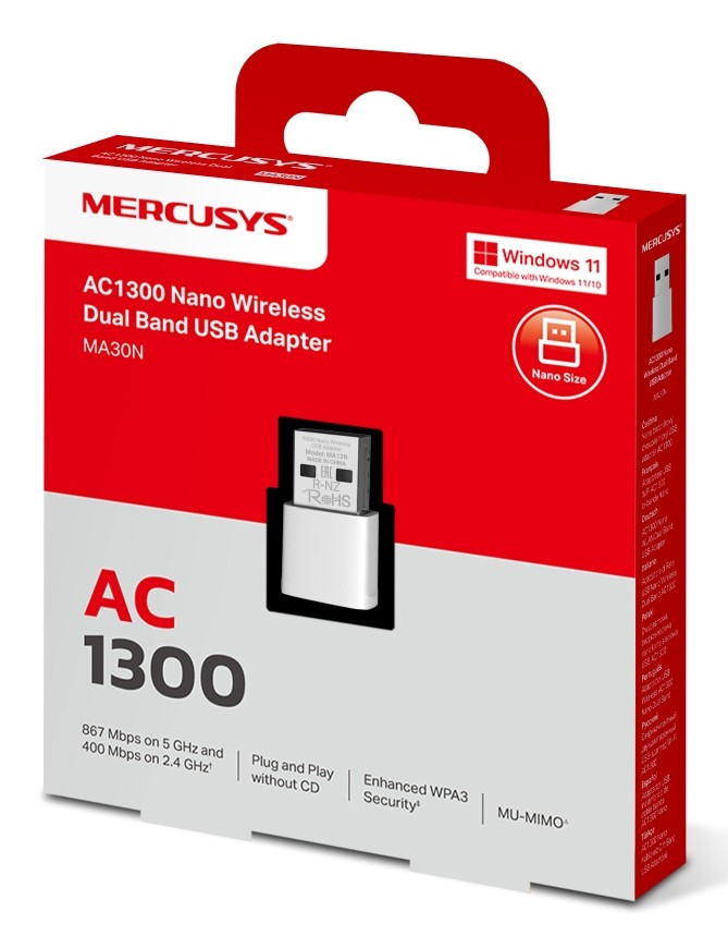 Mercusys MA30N. Tecnologia di connessione: Cablato, Interfaccia host: USB, Interfaccia: WLAN. Velocità massima di trasferimento dati: 1300 Mbit/s, Wi-Fi standard: Wi-Fi 5 (802.11ac), Banda Wi-Fi: Dual-band (2.4 GHz/5 GHz). Colore del prodotto: Bianco