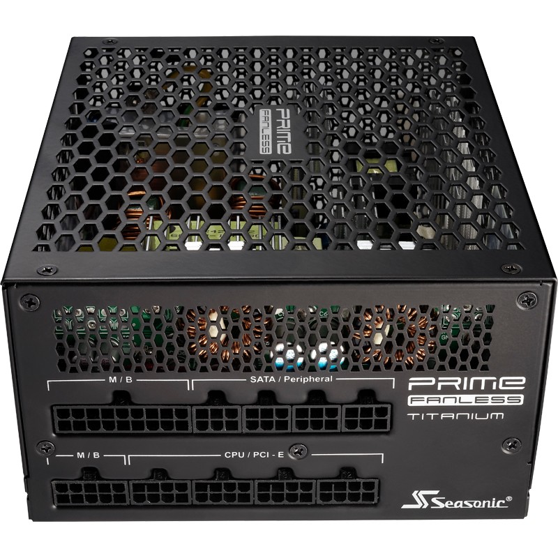 Seasonic Prime Titanium. Potenza totale: 600 W, Tensione di ingresso AC: 100 - 240 V, Frequenza di ingresso AC: 50 - 60 Hz. Connettore scheda madre: 20+4 pin ATX, Lunghezza del cavo di alimentazione della scheda madre: 61 cm, Lunghezza del cavo di alimentazione della periferica (Molex): 470 mm. Utilizzo: PC, Fattore di forma dell'unità di alimentazione (PSU): ATX, Certificazione 80 PLUS: 80 PLUS Titanium. Colore del prodotto: Nero, Tipo di raffreddamento: Passivo. Larghezza: 150 mm, Profondità: 170 mm, Altezza: 86 mm