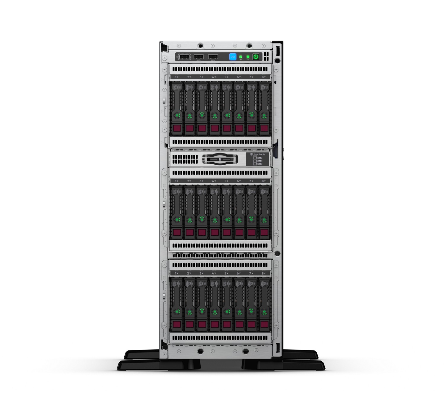 - ProLiant ML350 Gen10 offre espandibilità e flessibilità grazie agli alloggiamenti per unità misti LFF e SFF all'interno dello stesso server. Supporta da 8 a 24 SFF o 16 SFF se combinate con 8 unità SSD (Solid-State Drive) NVMe PCIe e da 4 a 12 unità LFF hot-plug o non hot-plug per proteggere l'investimento IT in un ambiente ibrido.