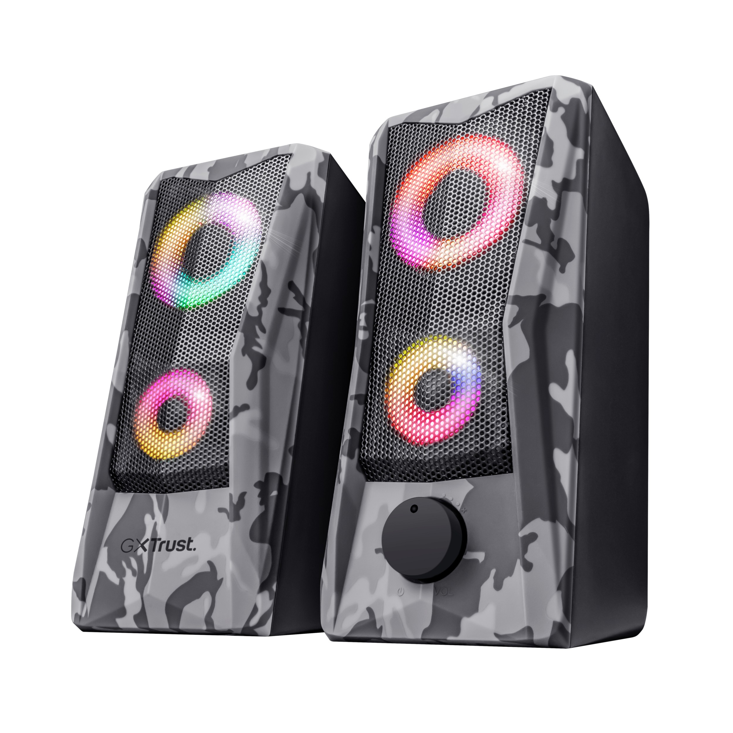 Set di altoparlanti 2.0 illuminato RGB Compatto set di altoparlanti con audace design e illuminazione LED RGB Audace e compatto Il set di altoparlanti GXT 606 Javv 2.0 a illuminazione RGB si evidenzia per l'avventurosa estetica mimetica e le luci colorate RGB, che infonderanno voglia di vincere. Per ascoltare in stereo l’audio del computer, senza dover indossare le cuffie. È semplice: basta inserire nel laptop la spina USB e il cavo aux e via! Dal design mimetico instilla lo spirito d'avventura Con Javv, la configurazione della scrivania assumerà un accento d'avventura. Con un design giocato sui toni di grigio del classico disegno mimetico, questo set di altoparlanti è destinato a ispirare audacia nelle sessioni di gioco e o conferire impulso al flusso di lavoro. La griglia metallica sulla parte anteriore di entrambi gli altoparlanti aggiunge un tocco di solidità, in termini sia di estetica che di durata. Al comando delle luci RGB Le caratteristiche di robustezza sono amplificate da un gioco di luci affascinante, e l'effetto breathing RGB trasforma dolcemente i colori. Le luci possono essere spente semplicemente dal controllo touch sull'altoparlante.