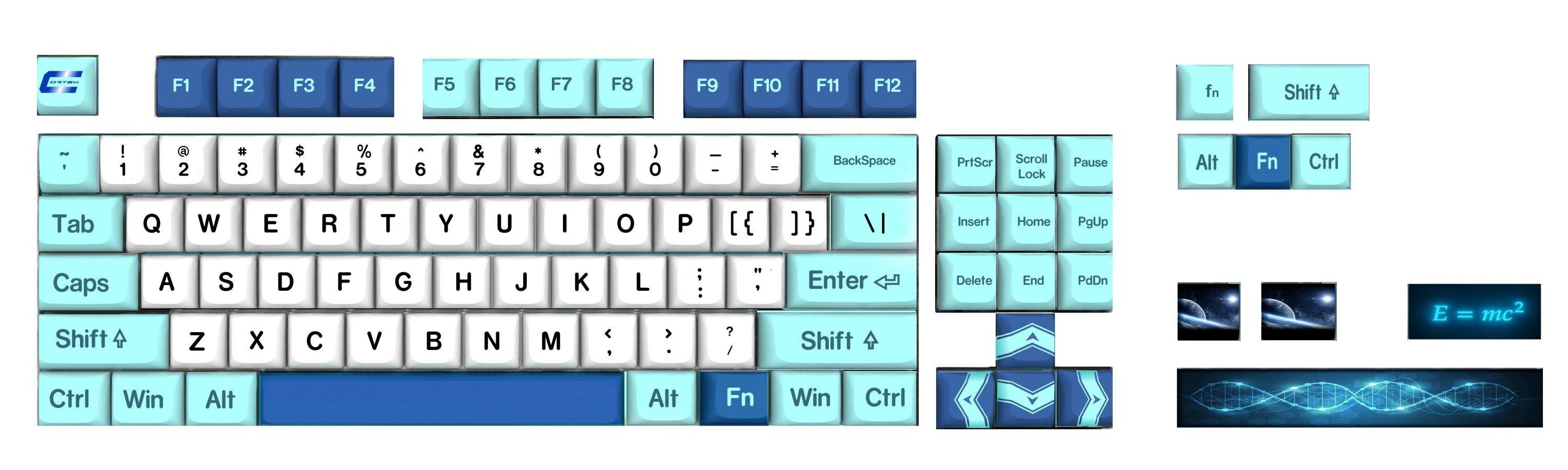 Si tratta un set di keycaps nel formato MDA.Sono gli stessi tasti montati sulla tastiera Cortek Science.E' un prodotto di altissima qualita', il processo e' di sublimazione sui 5 lati del tasto.Nella confezione troviamo 87 tasti (formato per le tastiere TKL) + 5 tasti per adattamento alle tastiere piu' piccole + 4 tasti tematici disegnati su tutti i 5 lati che raffigurano argomenti scientifici (formula energia/massa di Einstein, elica del DNA e astri).Il layout e' ANSI, disegnati sopra i tasti i caratteri USA e frontalmente i caratteri Italiani.Se accoppiati agli Switch Cortek Phantom Silent, offrono una digitazione particolarmente silenziosa e di elevatissimo comfort.Si installano su tutte le tastiere meccaniche con sottotasto a +