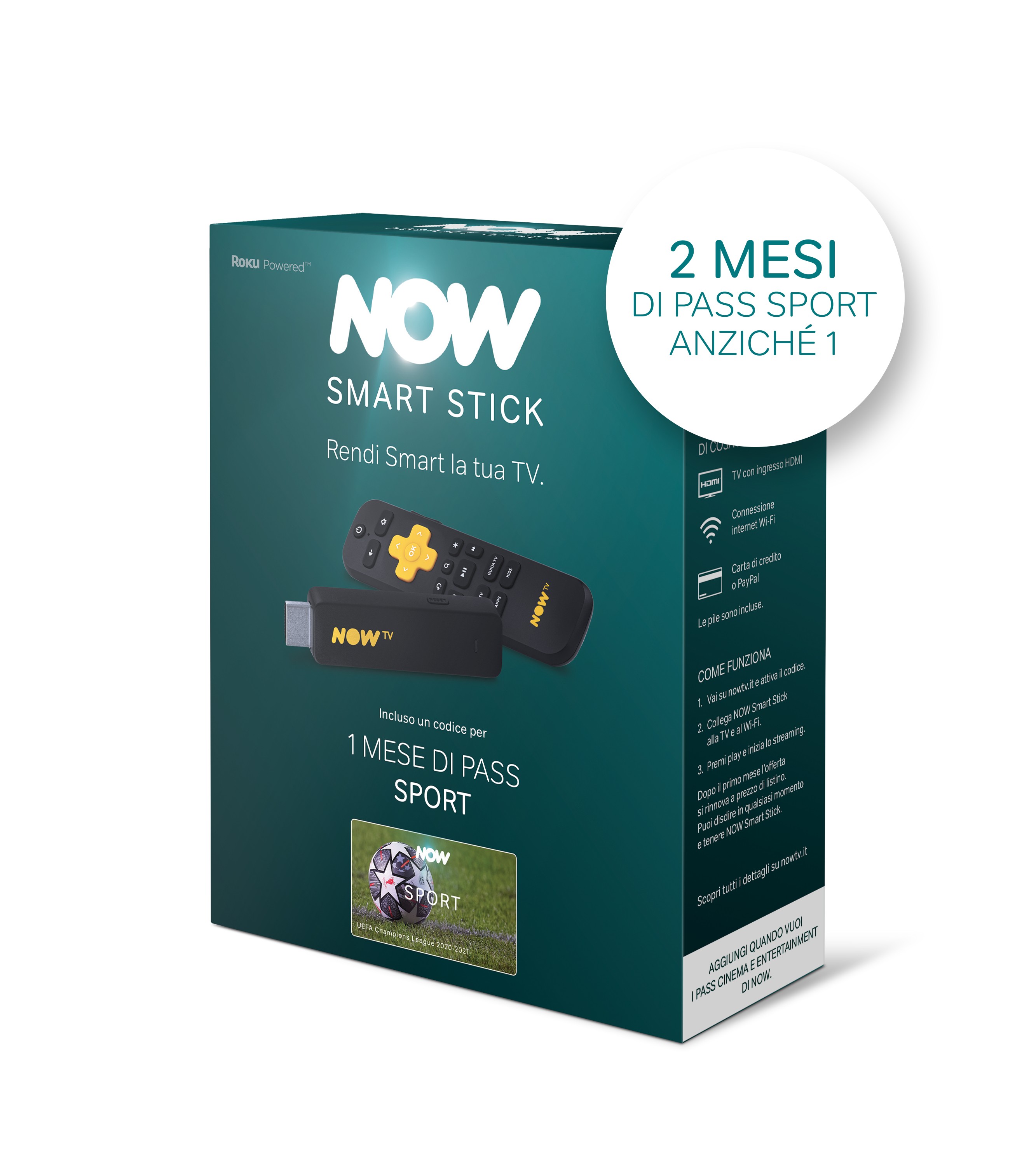 NOW Smart Stick con i primi 2 mesi inclusi del Pass Sport di NOW COS’ È NOW SMART STICK E COSA INCLUDE? - Cos’è NOW Smart Stick? È un dispositivo che ti permette di guardare i tuoi contenuti preferiti in streaming sulla tua TV anche se non hai una Smart TV o se l’app di NOW non è disponibile sulla tua TV. - Contenuti NOW inclusi - incluso un codice per 2 mese del Pass Sport di NOW in per guardare il calcio e lo sport di Sky in Super HD, attivabile entro il 31/12/2022. - Con NOW Smart Stick puoi accedere anche alle tue app preferite - Guarda i tuoi contenuti preferiti di Netflix, Prime Video, Disney+, YouTube e ascolta la musica che ami con Spotify. Scopri tutte le altre app disponibili per la tua TV (potrebbe essere necessario un abbonamento separato). - Di cosa hai bisogno? TV con ingresso HDMI, connessione Wi-Fi (di casa o dello smartphone) e carta di credito o PayPal. - Cosa Succede dopo il primo mese? Puoi disdire in qualsiasi momento fino a 24 ore prima della scadenza del periodo di visione. NOW Smart Stick resta tua. CHE CONTENUTI POSSO GUARDARE? Attiva il codice che trovi nella scatola potrai accedere a 2 mesi del: - Pass Sport di NOW per guardare in streaming le emozioni del Calcio e dello Sport firmato Sky: tutte le partite di UEFA Euro 2020, la Serie A TIM 2021-24 con 3 partite su 10 ogni giornata, la Serie BKT 2021-24 con tutte le 380 partite stagionali, oltre a playoff e playout, la UEFA Champions League 2020/2021, la UEFA Europa League 2020/2021, la Premier League con 5 partite a turno, la Bundesliga con 3 partite a turno, la MotoGP™, la Formula 1®, il Tennis internazionale con gli ATP Masters 1000, lo spettacolo della NBA, i canali Eurosport 1 e Eurosport 2 e molto altro. COSA SUCCEDE DOPO IL SECONDO MESE? Dopo il secondo mese l’offerta si rinnova a prezzo di listino, attualmente pari a 14,99€/mese. Puoi disdire in qualsiasi momento fino a 24 ore prima della scadenza del periodo di visione. NOW Smart Stick resta tua. COSA È INCLUSO NELLA CONFEZIONE? NOW Smart Stick, un codice per attivare 2 mesi del Pass Sport di NOW entro il 31/01/2022, telecomando, alimentatore, cavo, 2 pile AA e la guida alla configurazione COME ATTIVARE IL CODICE INCLUSO E ENTRO QUANDO ATTIVARLO? - Vai su nowtv.it e clicca in alto a destra su “ATTIVA CODICE” - Inserisci il codice alfanumerico che trovi sul voucher stampato all’interno della scatola - Accedi al tuo account o crea un nuovo account NOW - Inizia a guardare Il codice è attivabile fino al 31/12/2022. NOW è un servizio con addebito mensile anticipato e rinnovo automatico mensile che sarà possibile disattivare entro le 24 ore antecedenti la scadenza del periodo di visione su nowtv.it. NOW Smart Stick è un dispositivo Roku, azienda leader dello streaming TV. I dispositivi “Roku Powered” sono semplici da configurare, facili da usare e ideati per garantirti uno streaming perfetto dei tuoi programmi preferiti.