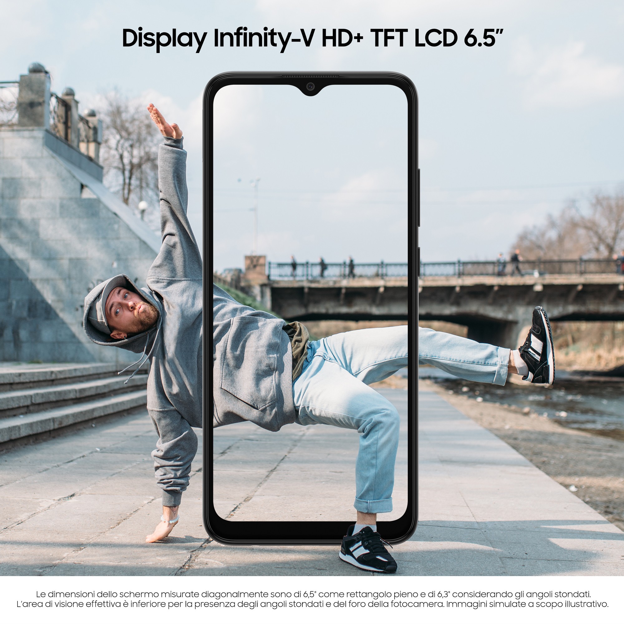 *Immagine simulata a scopo illustrativo.**Le dimensioni dello schermo misurate diagonalmente sono di 6,5" come rettangolo pieno e di 6,3" considerando gli angoli stondati. L’area di visione effettiva è inferiore per la presenza degli angoli stondati e del foro della fotocamera.