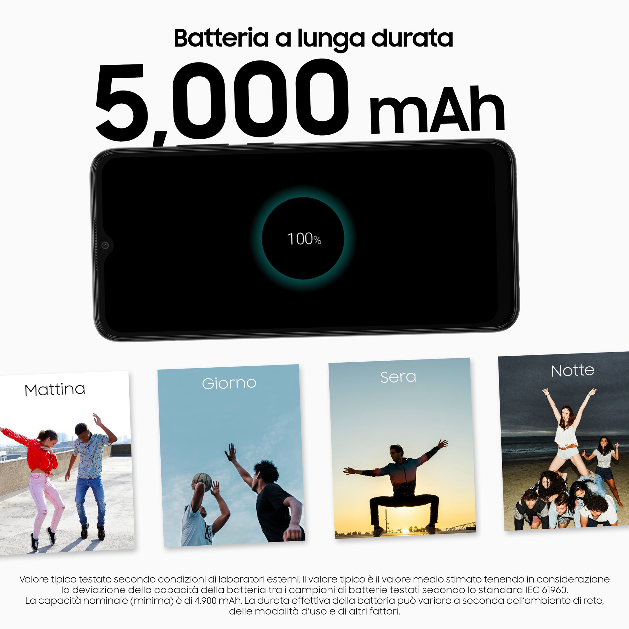 1. Valore tipico testato secondo condizioni di laboratori esterni. Il valore tipico è il valore medio stimato tenendo in considerazione la deviazione della capacità della batteria tra i campioni di batterie testati secondo lo standard IEC 61960. La capacità nominale (minima) è di 4.900 mAh. La durata effettiva della batteria può variare a seconda dell’ambiente di rete, delle modalità d’uso e di altri fattori.
