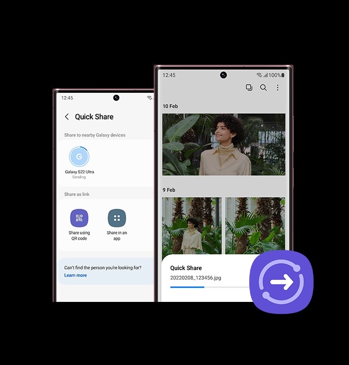 Grazie a Quick Share, puoi spostare i tuoi capolavori con un semplice tocco. Trasferisci foto e file video di grandi dimensioni sul tuo Tab o PC senza alcuno sforzo.