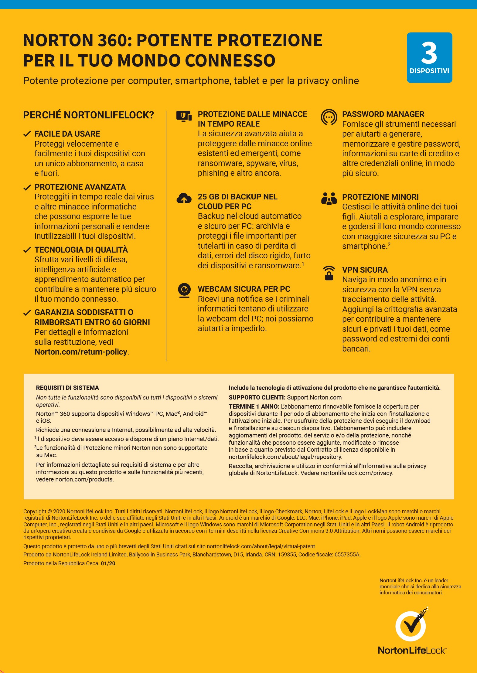 Norton 360 Deluxe offre una potente protezione potenti per i tuoi dispositivi e la tua privacy online – tutto in un'unica soluzione. I tuoi PC, Mac®, tablet e smartphone vengono protetti da virus, ransomware, phishing e altre minacce online mentre effettui transazioni bancarie, fai acquisti e navighi online. Secure VPN protegge le tue informazioni personali durante la trasmissione sui tuoi dispositivi, sia a casa sia in viaggio, con crittografia avanzata. Aiuta a impedire ai criminali informatici l'accesso alle tue informazioni personali quando ti connetti al Wi-Fi, anche pubblico. Norton 360 include anche Backup del PC nel cloud come misura preventiva contro la perdita di dati a causa di errori del disco rigido, dispositivi rubati e persino ransomware, Password Manager fornisce gli strumenti necessari per gestire password e accessi e protezione minori. Proteggere più dispositivi, tra cui PC, Mac®, smartphone e tablet, contro malware, phishing e ransomware (fino a 3 dispositivi) Accedere alle app e ai siti Web preferiti con la connessione Wi-Fi, a casa o in viaggio, con la sicurezza della crittografia avanzata con Secure VPN Generare, memorizzare e gestire password, informazioni su carte di credito e altre credenziali online – in modo più sicuro nel tuo vault crittografato sul cloud con Password Manager Salvare file e documenti importanti come misura preventiva contro la perdita di dati dovuta a errori del disco rigido, furto di dispositivi e anche ransomware con 25 GB di backup del PC nel cloud SafeCam avvisa immediatamente dei tentativi di accedere alla webcam e aiuta a bloccarne l'accesso non autorizzato Bloccare il traffico non autorizzato che tenta di comunicare con il computer con il Smart Firewall per PC Strumenti per i genitori per aiutare i bambini a esplorare Internet con maggiore sicurezza con protezione minori Protezione dalle minacce in tempo reale La sicurezza avanzata con antivirus aiuta a proteggere dalle minacce online esistenti ed emergenti per i dispositivi e a salvaguardare le informazioni riservate e finanziarie quando accedi online. Password Manager Strumenti per generare, memorizzare e gestire facilmente password, informazioni su carte di credito e altre credenziali online – in modo più sicuro. Secure VPN Naviga in modo anonimo e con maggiore sicurezza con la rete privata virtuale (VPN) senza tracciamento delle attività. Aggiungi la crittografia avanzata per contribuire a mantenere sicuri e privati i tuoi dati, come password ed estremi dei conti bancari. Backup del PC nel cloud Salva file e documenti importanti come misura preventiva contro la perdita di dati dovuta a errori dell’unità disco rigido, furto di dispositivi e ransomware. Protezione minori Gestisci le attività online dei tuoi figli. Aiutali a esplorare, imparare e godersi il loro mondo connesso con maggiore sicurezza su PC e smartphone. Password Manager Una password efficace è importante per proteggere i tuoi account di gioco. Possiamo aiutarti a memorizzare password complesse, dati della carta di credito e altre credenziali online in modo sicuro e protetto.