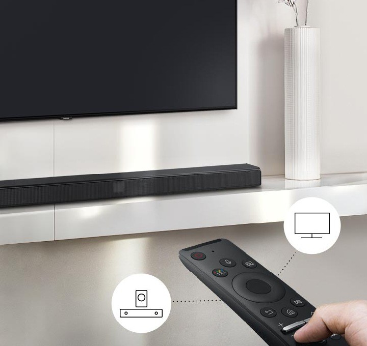 Non hai bisogno di tanti telecomandi. Puoi controllare le funzioni principali della soundbar, come potenza, volume ed effetti sonori, direttamente dal telecomando del tuo TV Samsung.