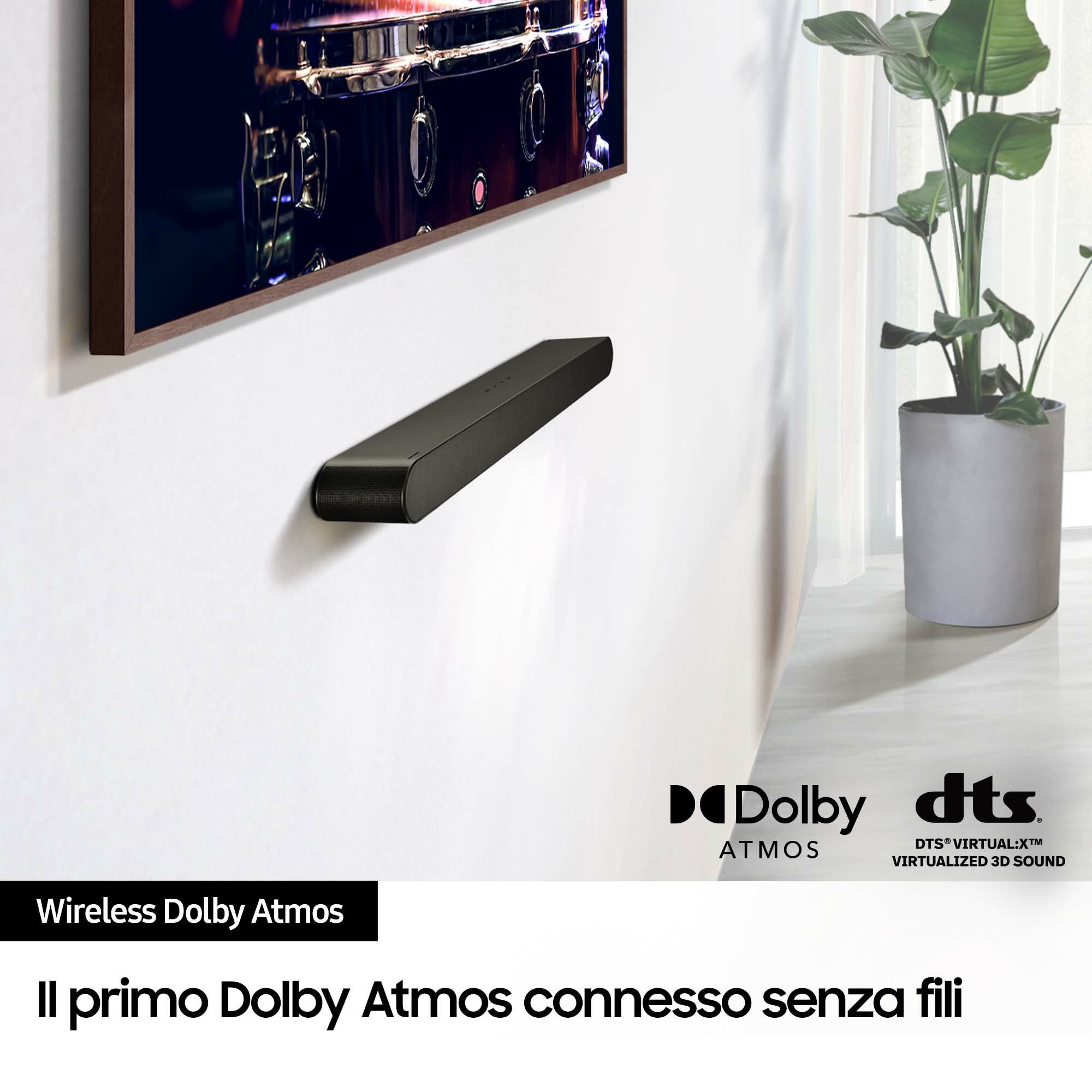 Il formato audio Dolby Atmos Object-based è integrato in modalità wireless nella soundbar Samsung. Vivi un'esperienza audio 3D di ultima generazione, per distinguere nitidamente ogni suono da qualunque direzione.