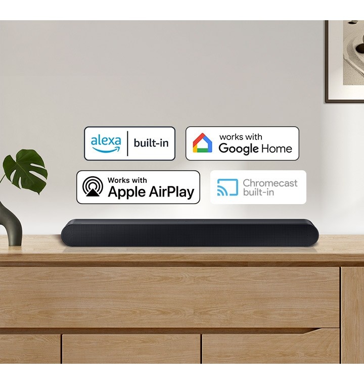 Potrai controllare la soundbar con i comandi vocali utilizzando la funzione Alexa integrata o un dispositivo compatibile con lAssistente Google con Chromecast integrato, oppure utilizzare Chromecast integrato per riprodurre in streaming diversi contenuti audio, compresi i tuoi brani preferiti. In alternativa, puoi anche collegarti ad AirPlay per riprodurre contenuti in streaming: per farlo, ti basterà toccare l'icona AirPlay sul tuo dispositivo Apple. Con Apple AirPlay, puoi ascoltare la tua musica o i tuoi podcast preferiti direttamente dalliPhone o dalliPad.