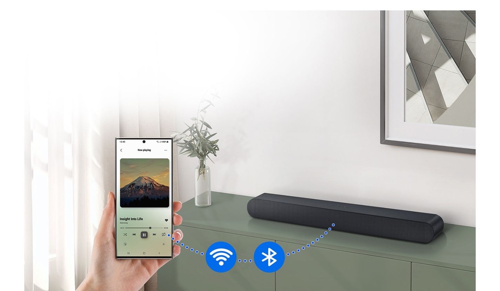 Effettua il mirroring dell'audio del cellulare sulla soundbar. Con un semplice tocco, potrai riprodurre immediatamente la musica dalla soundbar con una qualità incredibile.