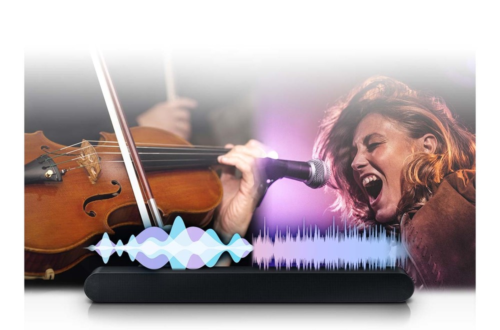 Con la tecnologia Q-Symphony gli altoparlanti del TV e la soundbar riprodurranno suoni contemporaneamente per ottenere la massima sinergia, con un audio ottimizzato basato sullAI che viene diffuso da tutti i canali.
