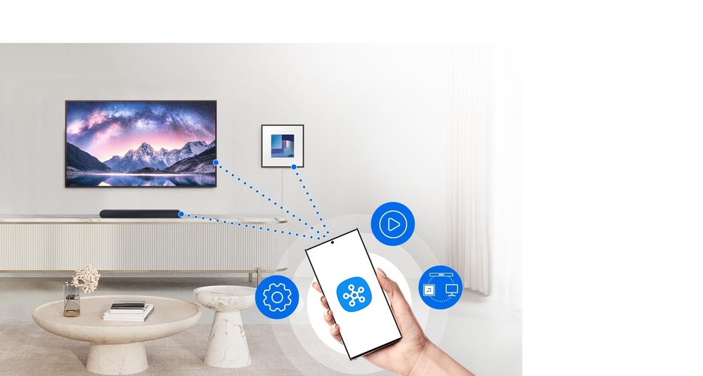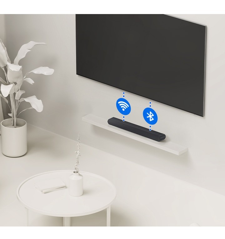 Collega la tua soundbar al TV Samsung con Wi-Fi o Bluetooth in pochi istanti. Audio e video perfettamente sincronizzati, per un'esperienza di visione incredibilmente immersiva.
